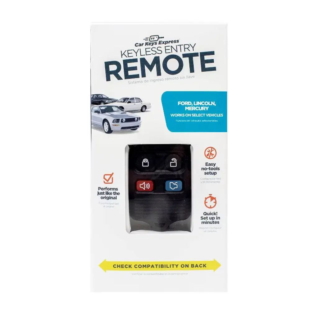 One brand new, aftermarket FORD replacement keyless entry remote. Replaces vehicle manufacturer's original remote. Remote has 4 button functions including Lock, Unlock, Trunk, and Panic. DIY programming instructions are included with this remote.Compatible Vehicles:Ford Crown Victoria (1995-2011)Ford Escape (2007-2013)Ford Escort (1998-2003)Ford Expedition (2003-2012)Ford Explorer (2002-2012)Ford Five Hundred (2005-2007)Ford Focus (2000-2013)Ford Freestar (2005)Ford Fusion (2008-2012)Ford Mustang (1998-2014)Ford Shelby GT500 (2007-2015)Ford Taurus (1998-2013)Ford Thunderbird (2002-2005)Ford Windstar (1999-2000)Lincoln Aviator (2003-2005)Lincoln LS (2000-2006)Lincoln MKS (2009-2012)Lincoln Navigator (2003-2012)Lincoln Town Car (1998-2011)Lincoln Zephyr (2006)Mercury Cougar (1999-2002)Mercury Grand Marquis (2000-2011)Mercury Marauder (2003-2004)Mercury Milan (2010)Mercury Montego (2005-2007)Mercury Monterey (2004-2007)Mercury Mountaineer (2002-2010)Mercury Sable (1998-2009)Mercury Tracer (1998-1999)