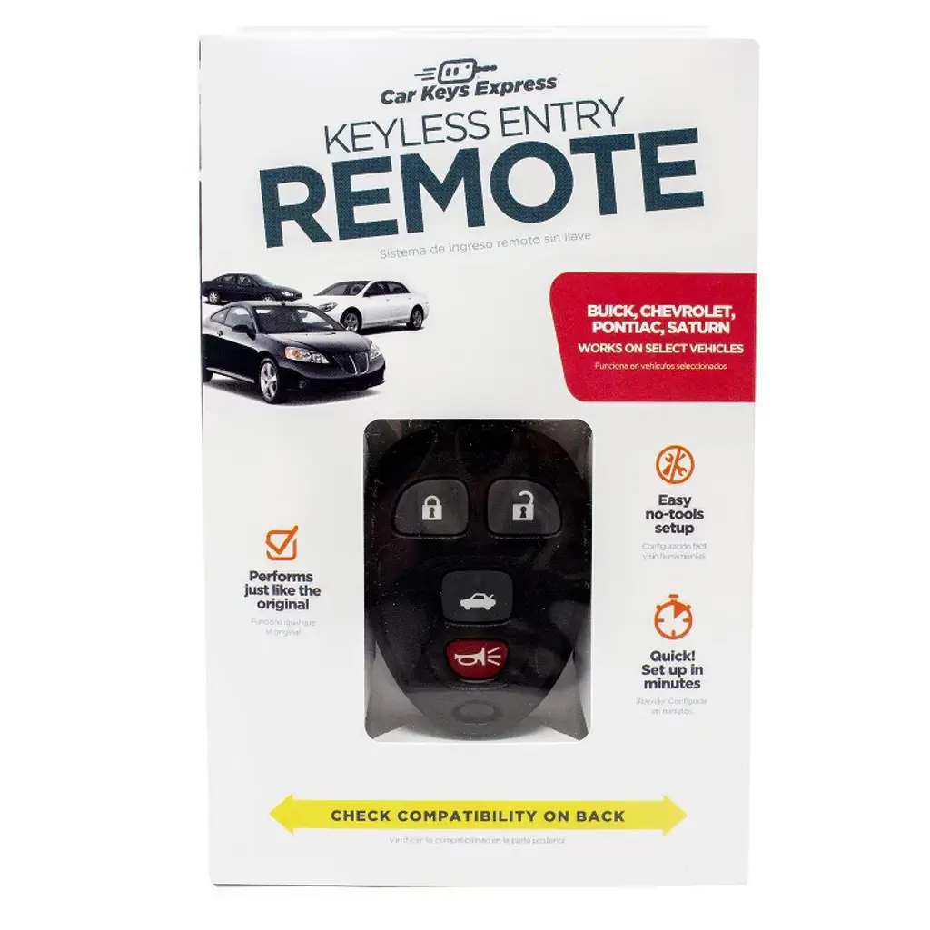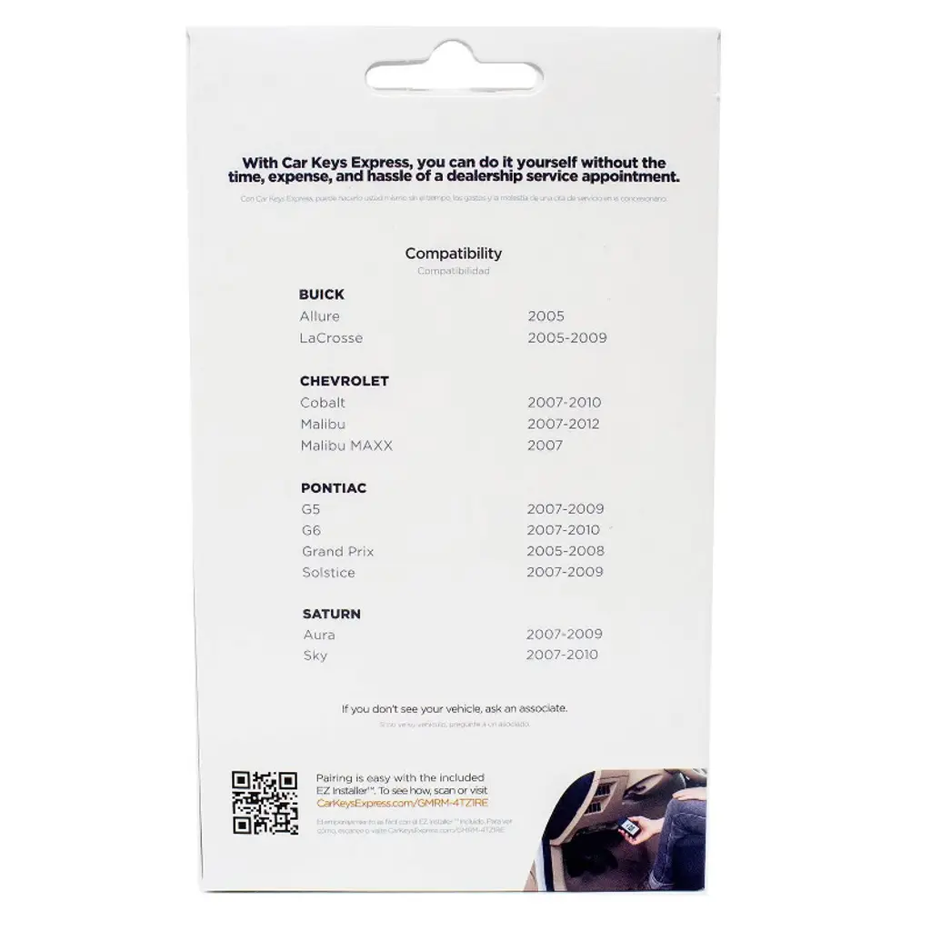 GM Keyless entry replacement remote with pairing device included. Replaces vehicle manufacturer's original remote. This remote has 4 button functions including Lock, Unlock, Trunk, and Panic. The EZ Installer DIY pairing dongle allows you to pair your remote entirely on your own. Avoid the hassle and expense of having to go to the dealership for pairing. The EZ Installer is a single vehicle use pairing tool. Once you use it on your vehicle, it cannot be used on another.Compatible Vehicles:Buick Allure (2005)Buick LaCrosse (2005-2009)Chevrolet Cobalt (2007-2010)Chevrolet Malibu (2007-2012)Chevrolet Malibu MAXX (2007)Pontiac G5 (2007-2009)Pontiac G6 (2007-2010)Pontiac Grand Prix (2005-2008)Pontiac Solstice (2007-2009)Saturn Aura (2007-2010)Saturn Sky (2007-2010)
