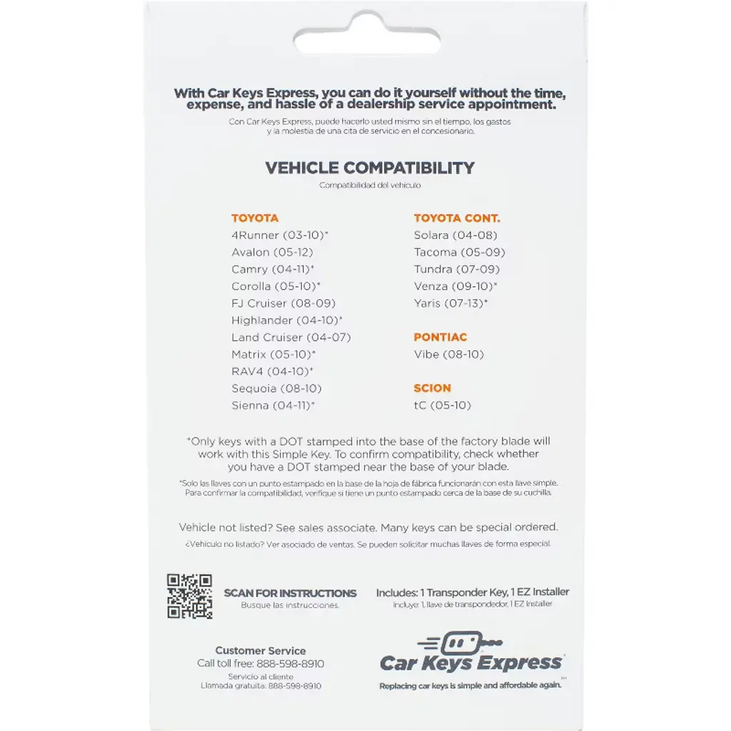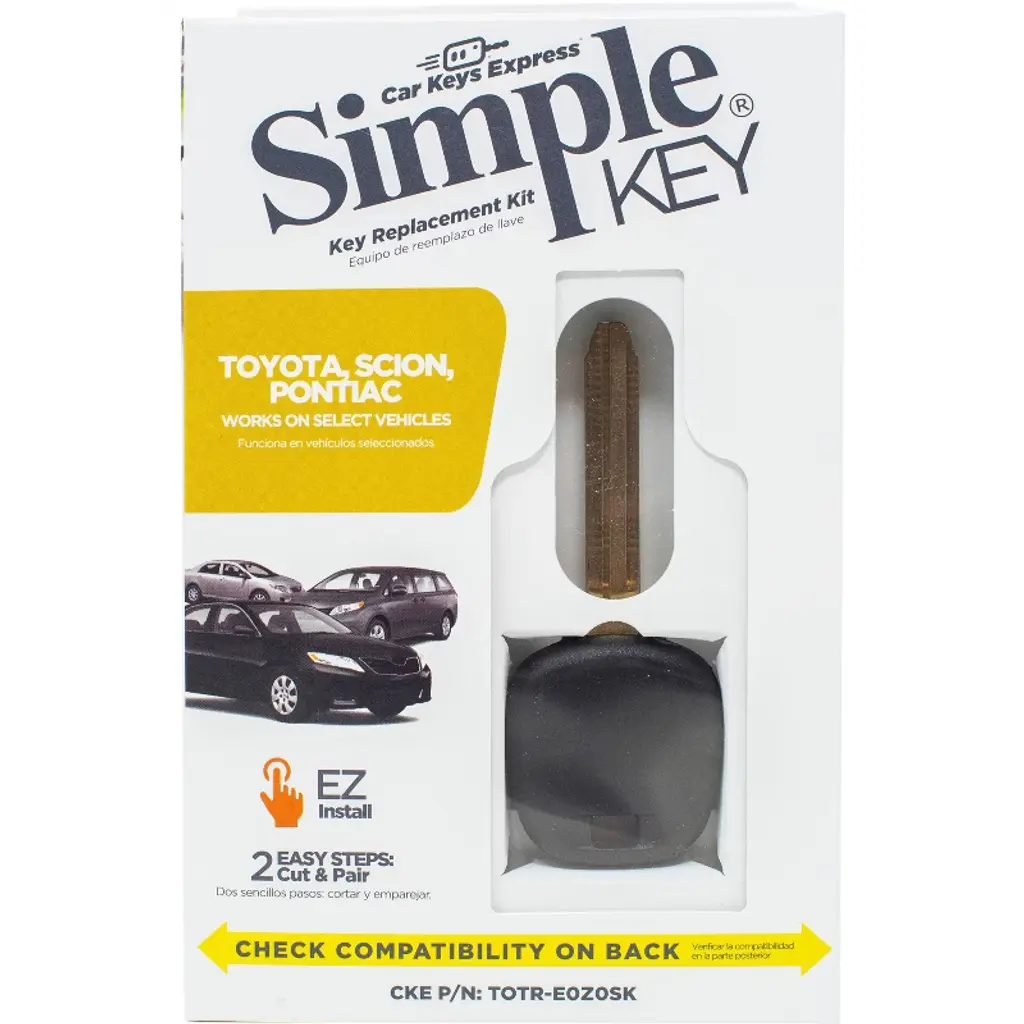 Simple Key is a new way for consumers to easily replace modern car keys. The consumer-friendly kit includes an uncut Transponder Key and EZ Installer. This ignition key has a chip hidden inside of the plastic head. It is a part of your automobile security system to prevent theft. Therefore, you MUST get it both cut and programmed. Cutting only will NOT allow you to start the engine. The key blade can be cut at most hardware stores, car dealers, or automotive locksmiths. Then, the EZ Installer is used to pair the key to the vehicle in just a few minutes. Works just like your OEM key. Avoid the hassle and expense of having to go to the dealership for pairing. The EZ Installer is a single vehicle use pairing tool. Once you use it on your vehicle, it cannot be used on another.Compatible Vehicles:Pontiac Vibe (2008-2010)Scion tC (2005-2010)Toyota 4Runner (2003-2009)Toyota Avalon (2005-2012)Toyota Camry (2004-2011)Toyota Corolla (2005-2010)Toyota FJ Cruiser (2008-2009)Toyota Highlander (2004-2010)Toyota Land Cruiser (2004-2007)Toyota Matrix (2005-2010)Toyota RAV4 (2004-2010)Toyota Sequoia (2008-2010)Toyota Sienna (2004-2011)Toyota Solara (2004-2008)Toyota Tacoma (2005-2009)Toyota Tundra (2007-2009)Toyota Venza (2009-2010)Toyota Yaris (2007-2013)