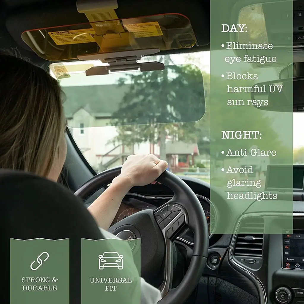 Zone Tech Day and Night Anti-Glare Car Windshield Visor - Premium Quality Universal Sunshade and Night Vision Anti-Dazzle Windshield Driving Visor Tired of getting your eyes irritated by the sun while driving? Then the Zone Tech Day and Night Anti-Glare Car Windshield Visor is the Best Thing you can use. It will Protect you from infrared UV rays and gives you Better Visibility while driving. This is a Great Deal that one can take advantage of; especially the features that it offers are the ones that will surely satisfy your needs. The Zone Tech car anti-glare visor helps against sudden glare from bright sunshine and is particularly useful in low winter sunshine when existing sun visor is inadequate. This dims strong or high beam lights from car or other sources pointing directly at you while driving at night and the solar panels can filter out 90% of harmful rays protecting your eyes effectively .It has a strong light blocking rate about 2.6% and Anti-UV 97.3, isolation of ultraviolet (UV) light (315 nm - 380 nm). It avoids sun glare stabbed shot to ease eyestrain. This is ideal for people who are more susceptible to glare. It relieves eye fatigue and effectively protects the safety of driving under the strong light. The Zone Tech car anti-glare visor is made from premium quality thick, very strong, safe and durable PP & TPR material to give maximum strength and durability for long lasting usage. It is universal in size, compatible with all vehicles. It is very quick and easy to install, just clip it onto your overhead visor. It can be adjusted by rotating 180 degree to accommodate your needs. It can also be kept easily in the storage when not in use. Once folded back into place, the space it takes up is minimal.Zone Tech brand is known worldwide with superior product quality and service!