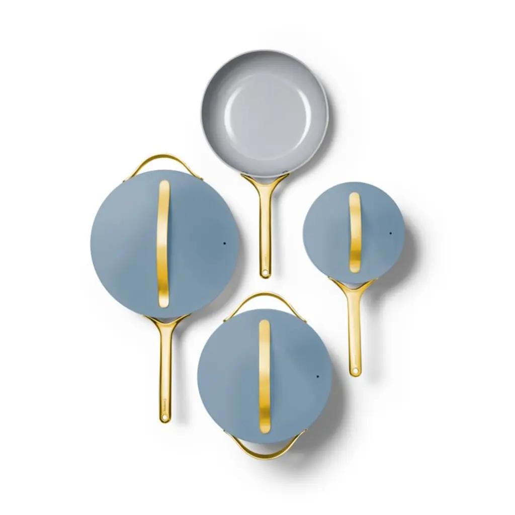 Caraway's modern, minimalist cookware in a blue inspired by serene lagoons that you'll only find at Crate & Barrel. Adorned with gleaming gold-finished handles that add a subtle touch of glam, this display-worthy set is a joy to use. Aluminum conducts heat evenly and efficiently, while a double layer of ceramic coating provides superior non-stick performance. Going from stove to oven to table for a beautiful presentation, this set combines a frying pan, saucepan, saute pan and Dutch oven.
