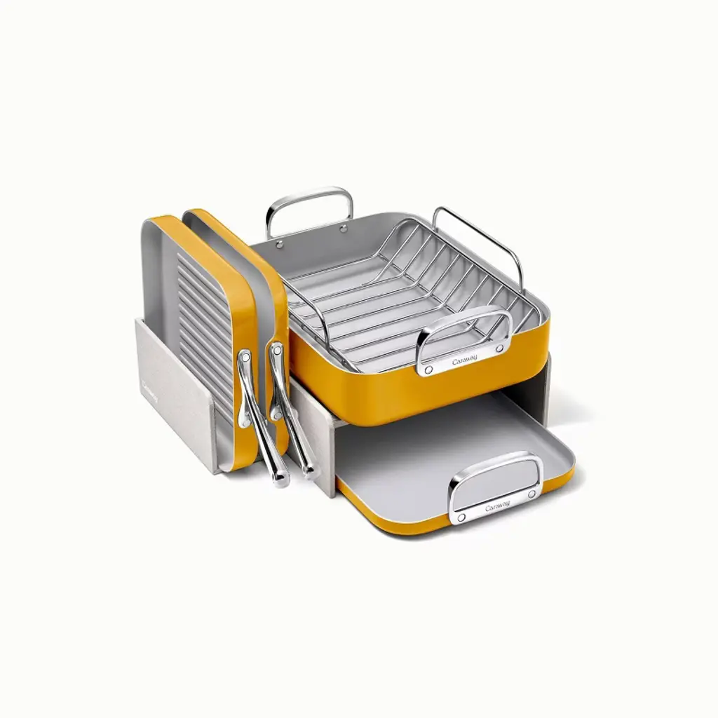 Clean cooking gets squared away with Caraway’s non-toxic Squareware Set. Featuring our signature non-stick ceramic coating, these four spacious pans are perfect for recipes that need a bit more room. Sets include complimentary magnetic organizers to keep your cabinets tidy.
