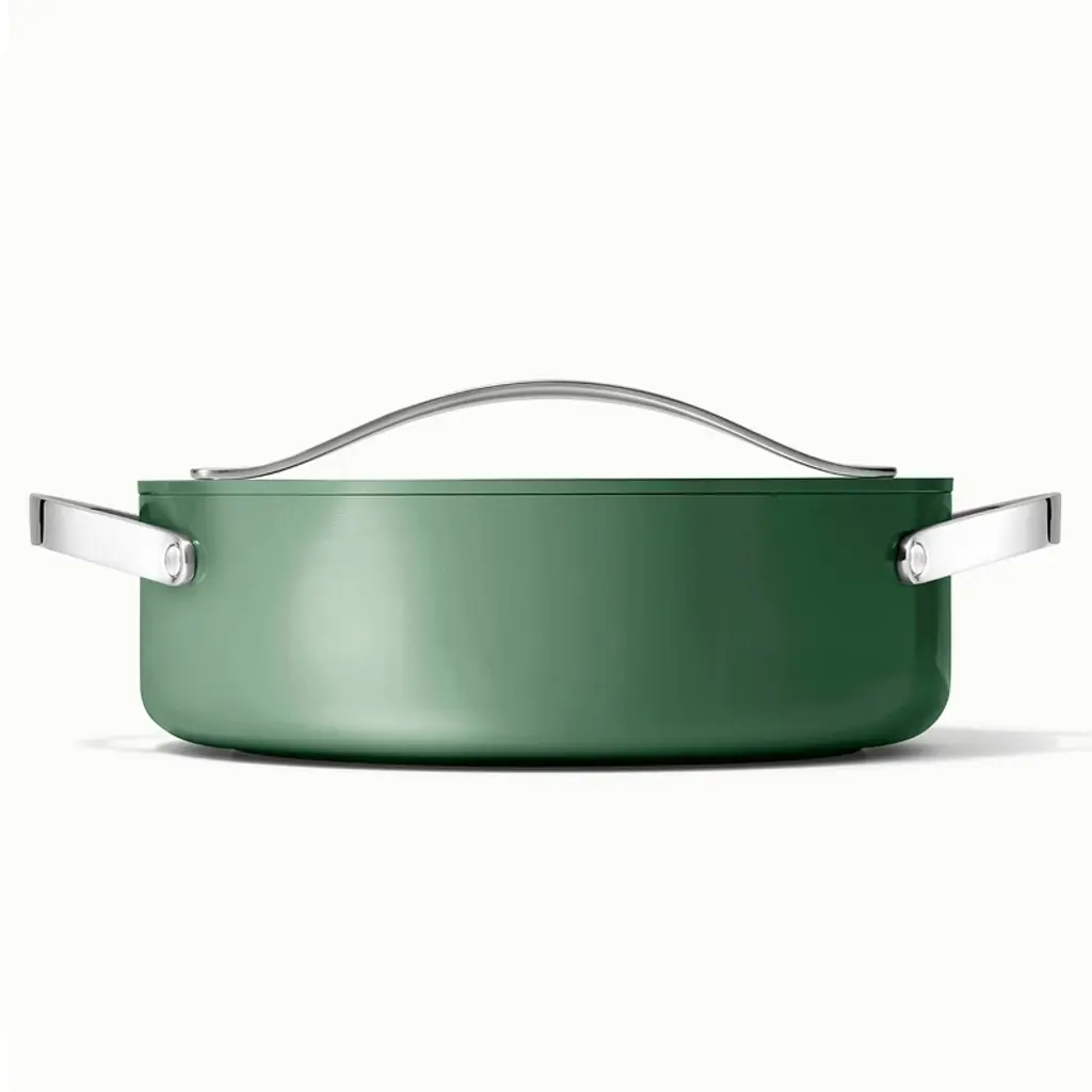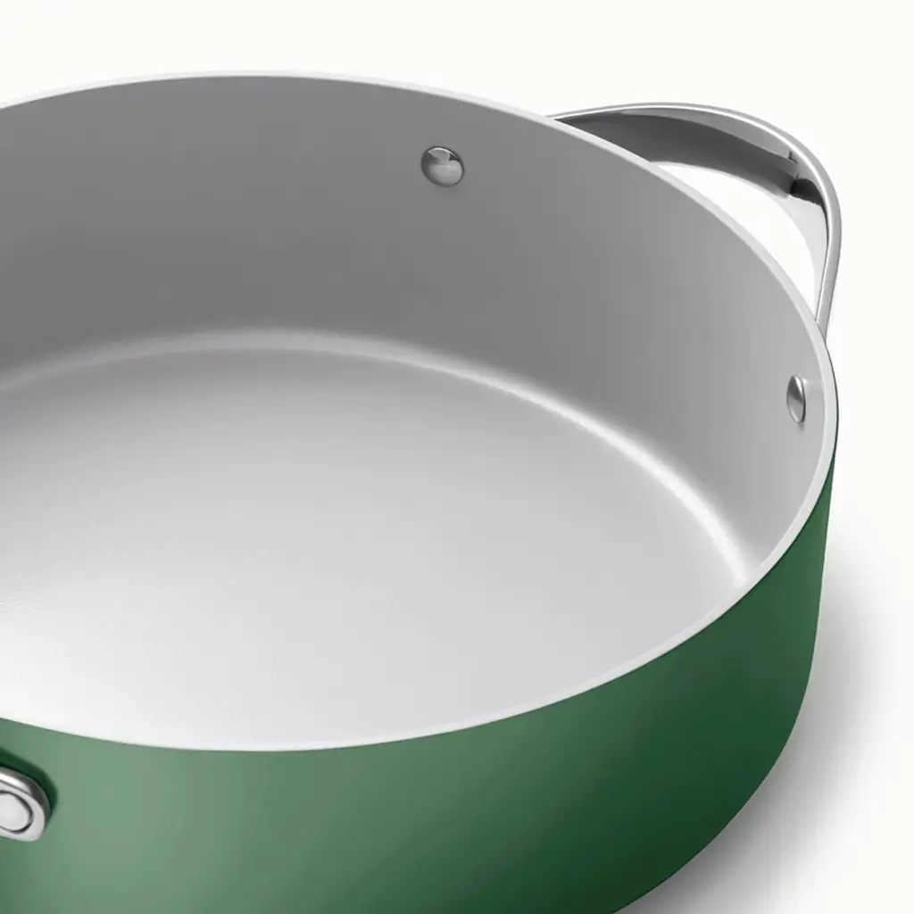 Our Rondeau is the MVP of one-pan meals, made with our signature non-stick, non-toxic ceramic coating. Thanks to the high, straight walls, you can simmer, braise, or fry without a mess. The large surface area is perfect for browning before finishing in the oven, and with two stainless steel handles, you can easily move your dish from the stove to the oven or table. Lid included.