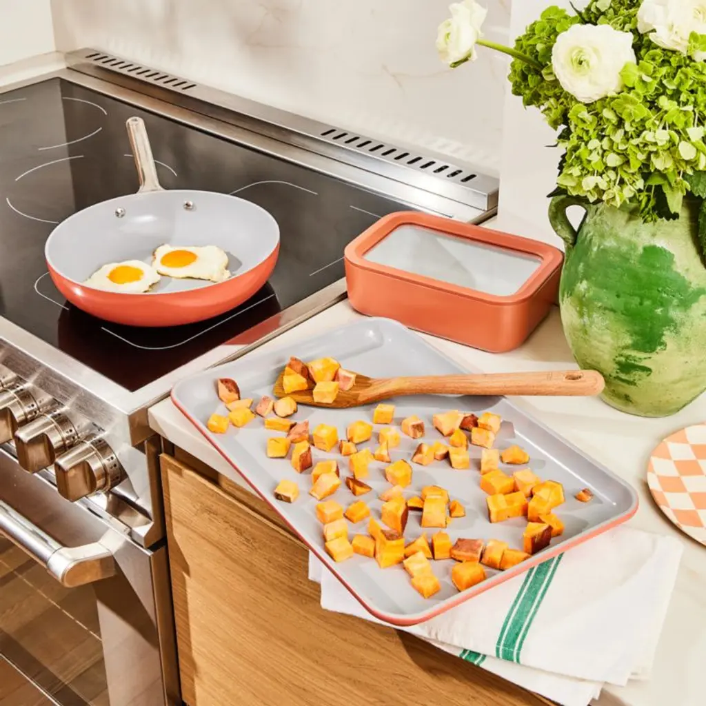 Bake a side dish, half-batch of cookies or sheet-pan dinner for one on this essential baking sheet. Finished in a naturally non-stick ceramic coating, the aluminized steel pan releases baked goods easily for quick cleanup. The perracottaCaraway's distinctive pink and terracotta hueexterior gives the sheet a fresh look. Pair with other Caraway Home pans to build a modern bakeware collection.