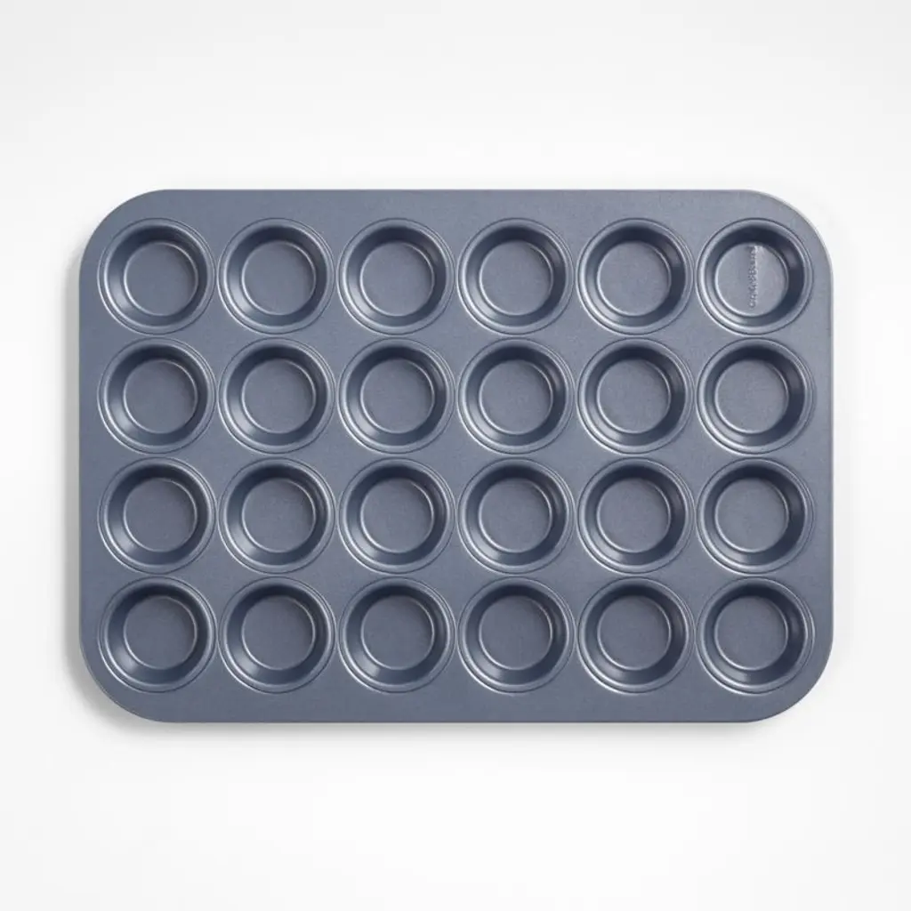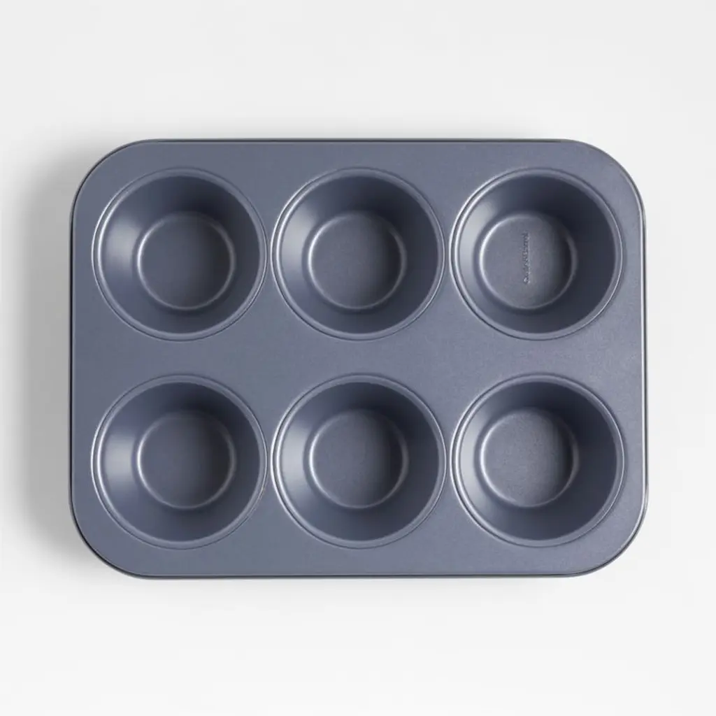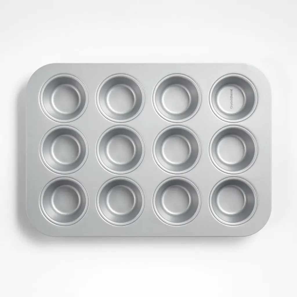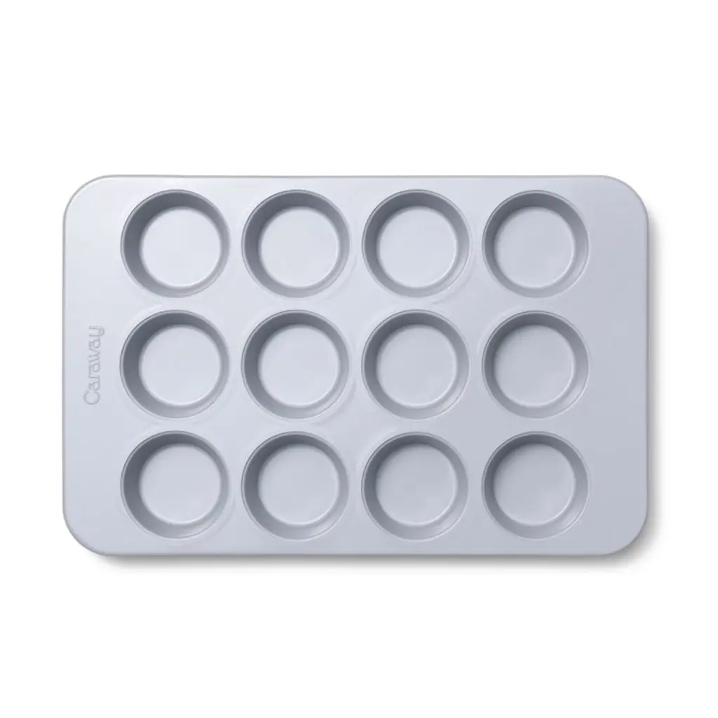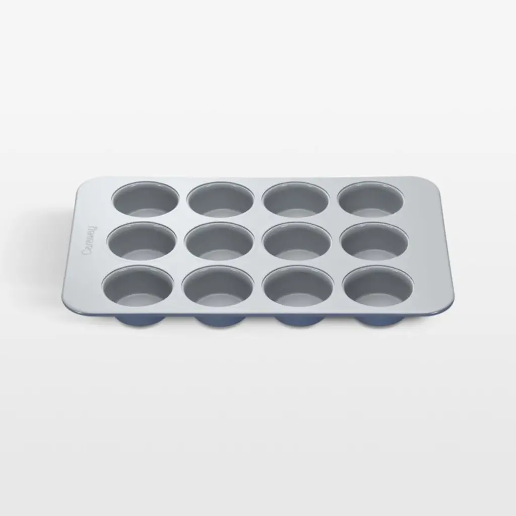 Bake a dozen muffins, cupcakes or mini quiches in this essential baking pan. Finished in a naturally non-stick ceramic coating, the aluminized steel muffin tin releases baked goods easily for quick cleanup. The slate blue exterior gives the pan a fresh look. Pair with other Caraway Home bakeware to build a modern collection.