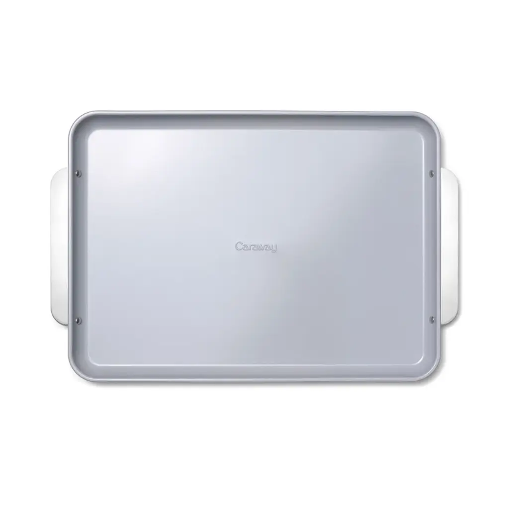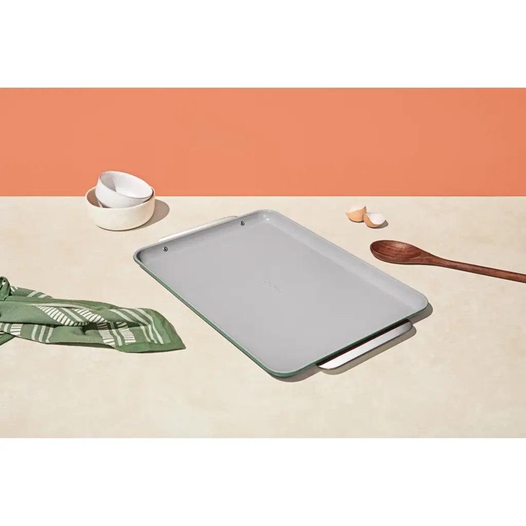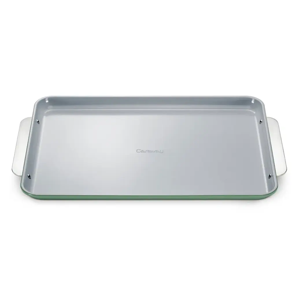 Caraway's 18" x 13" Large Baking Sheet is the easy-to-handle answer for big batches of everything. Use for baking, roasting, and more. Featuring a non-toxic, naturally slick ceramic coating, healthy baking has never been easier.
