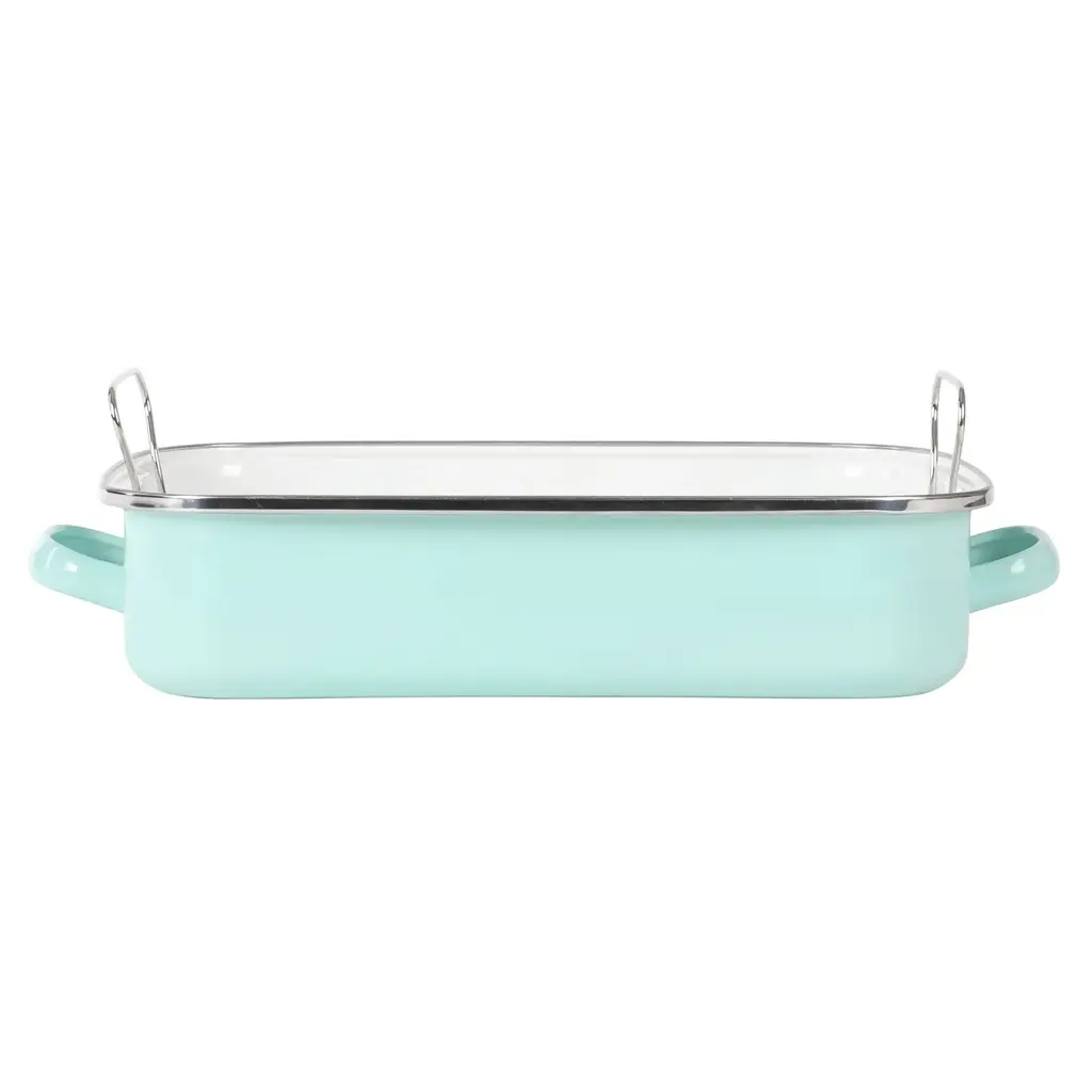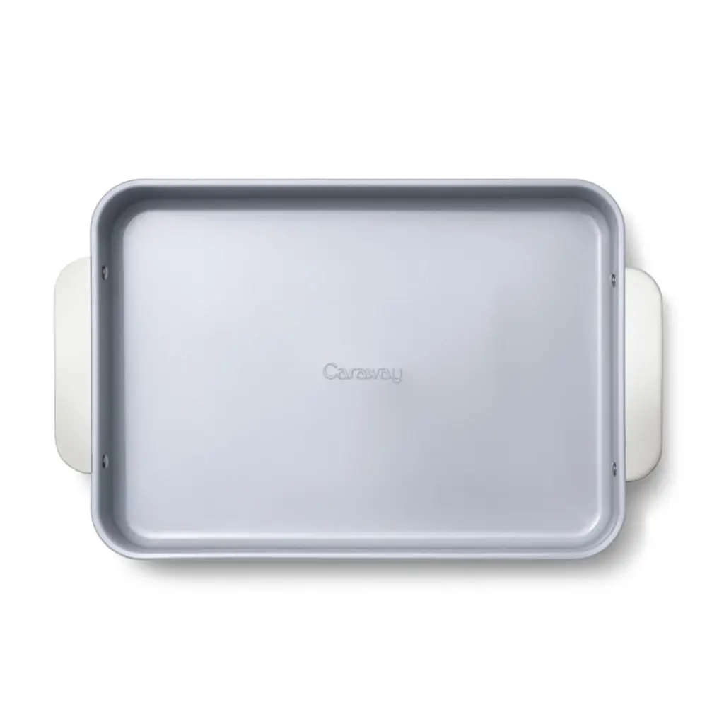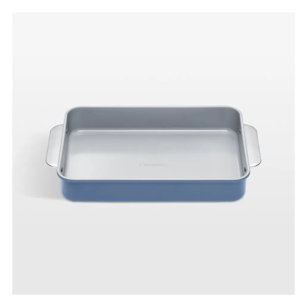 Bake bar cookies, pecan rolls and lasagna in this essential baking pan. Finished in a naturally non-stick ceramic coating, the aluminized steel pan releases baked goods easily for quick cleanup. Stainless steel handles offer a sturdy grip, and the slate blue exterior gives the rectangular pan a fresh look. Pair with other Caraway Home bakeware to build a modern collection.