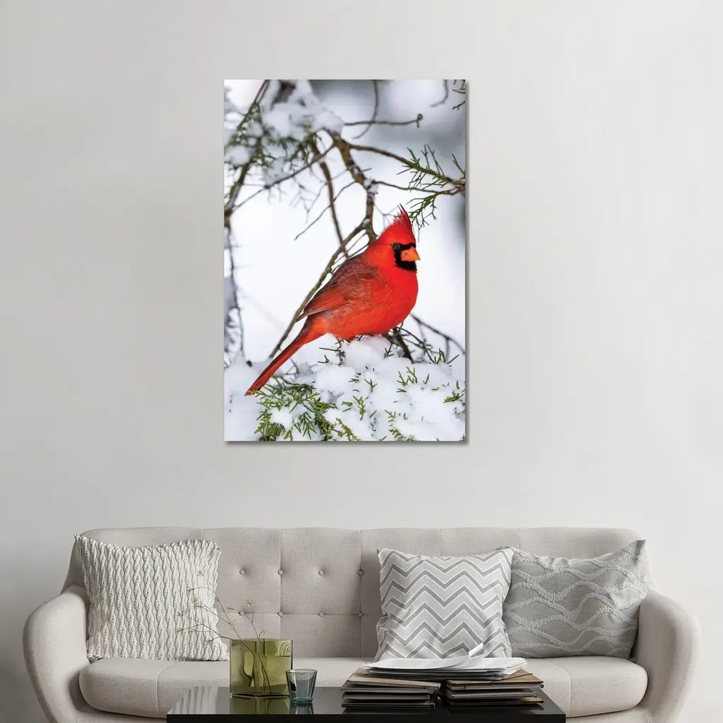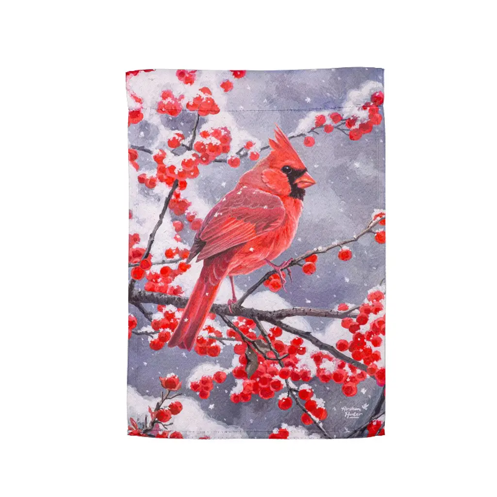 Finish off any winter-themed garden display with this Cardinal in Pines Applique House Flag. It features a beautiful Cardinal sitting in the trees with snow falling around it. It's perfect for anyone wanting to add a traditional touch to their holiday decor.