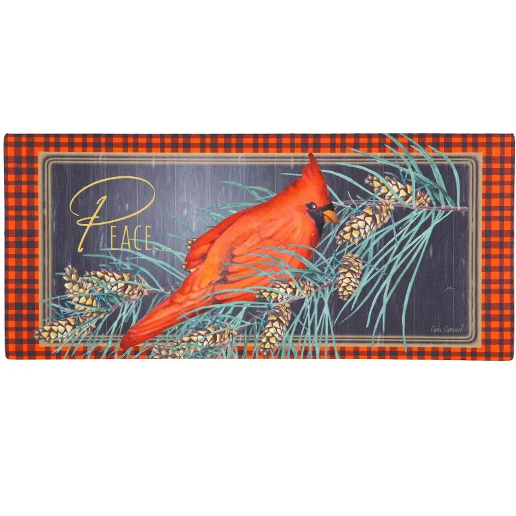 Welcome everyone to the home with this Sassafras switch mat. It features a beautiful cardinal sitting on a branch with pinecones. A red plaid border and sweet "Peace" message add the final touches to this mat.