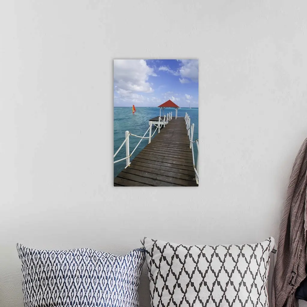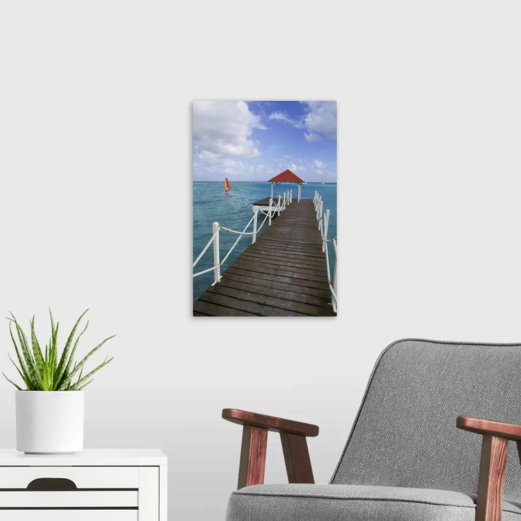 Caribbean, Guadeloupe. Colorful dock and crystal blue water