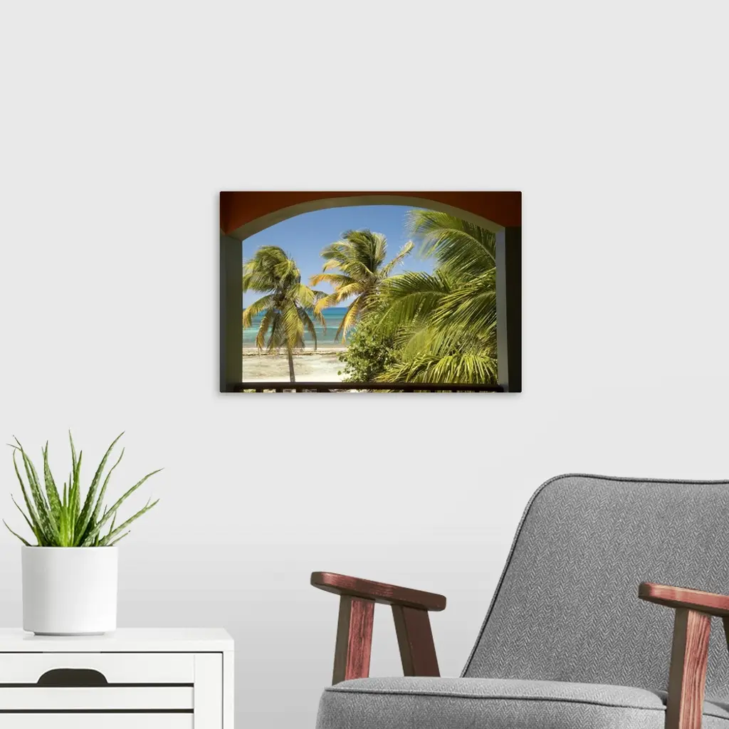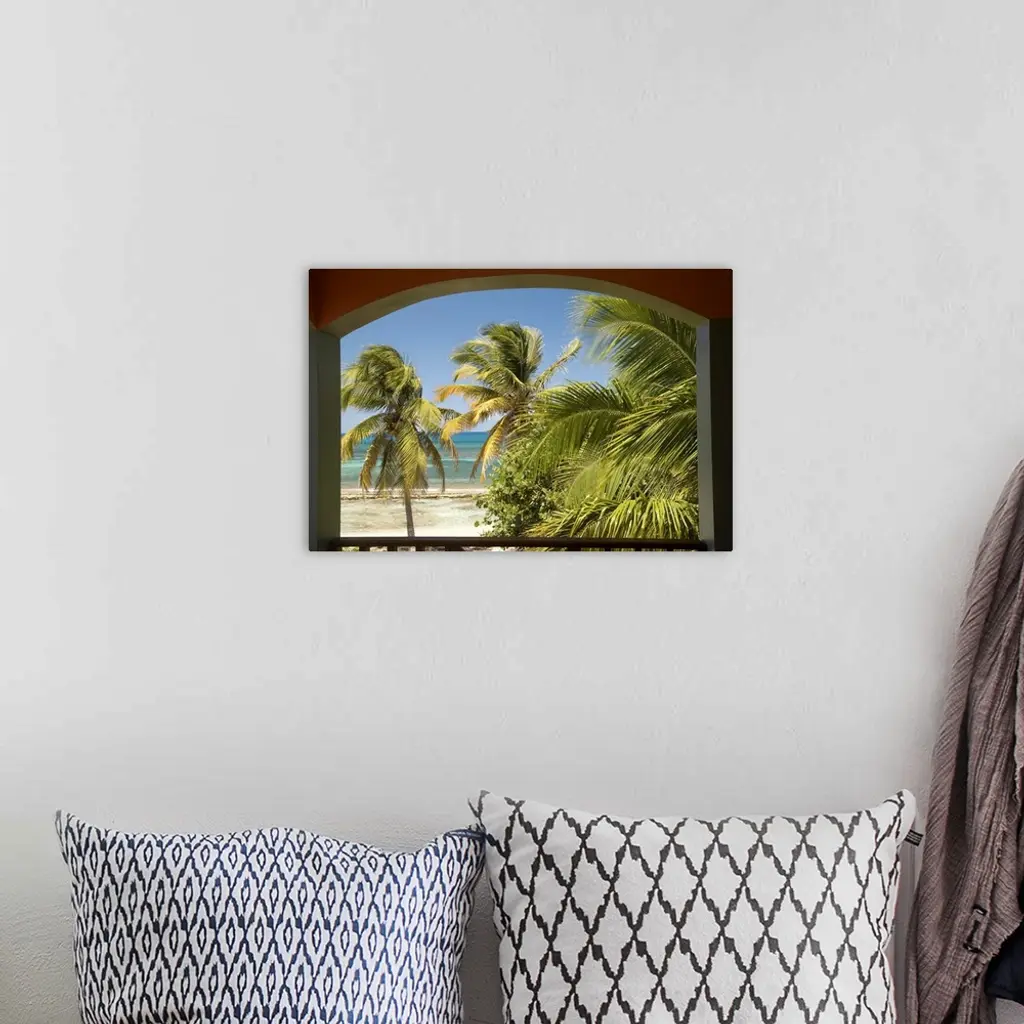 Caribbean, Puerto Rico, Vieques. Caribbean, beach and palm trees, viewed from porch of house/hotel. PR