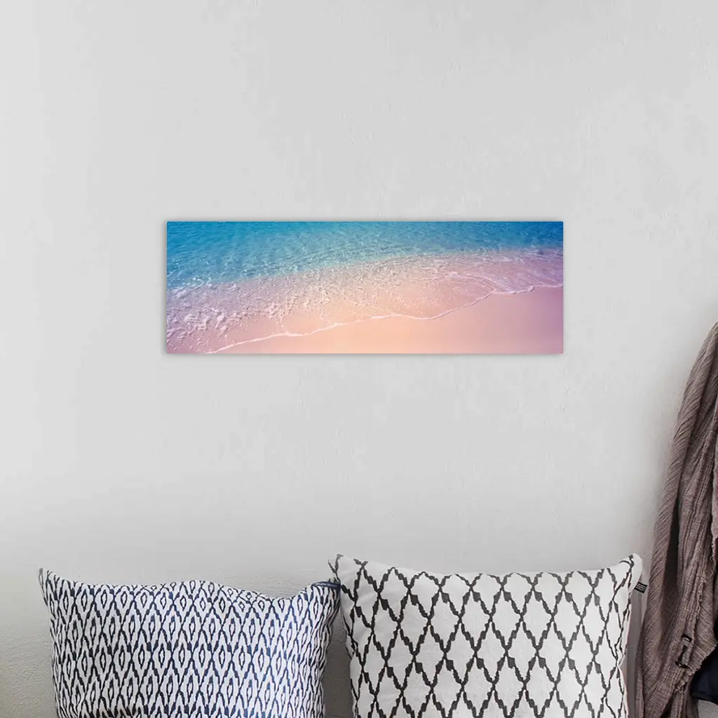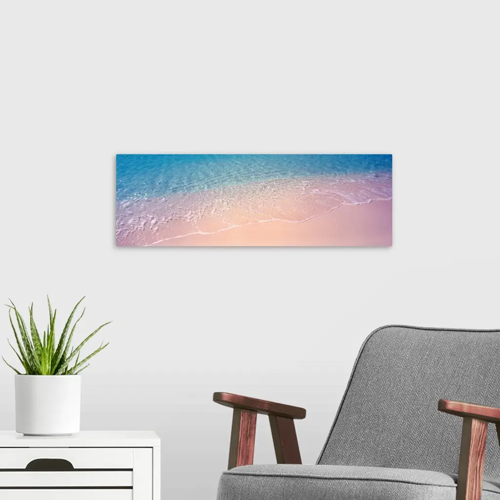 Panoramic photograph concentrates on a small section of clear ocean water as it gently washes onto a sandy shore.