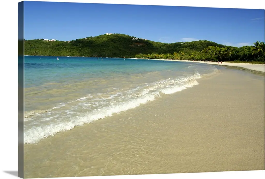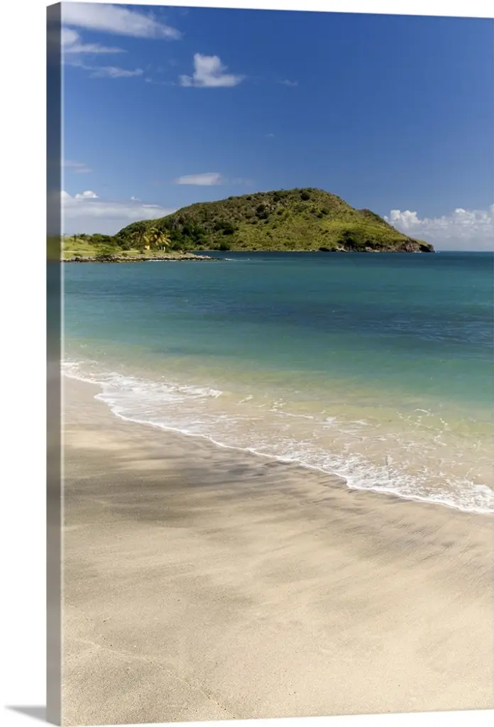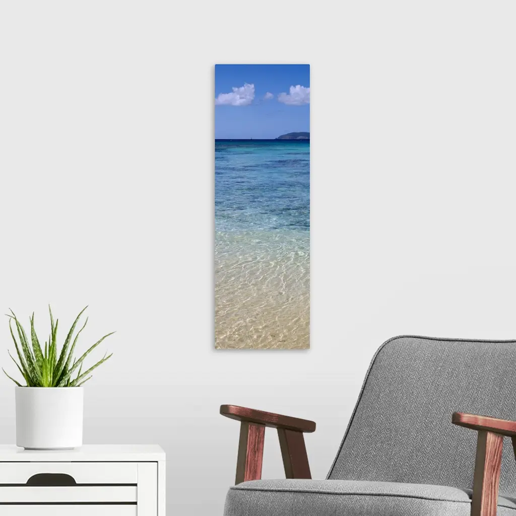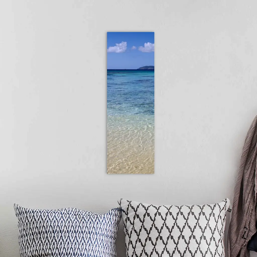 Tall and narrow canvas print of clear Caribbean ocean water with a mountain in the distance.