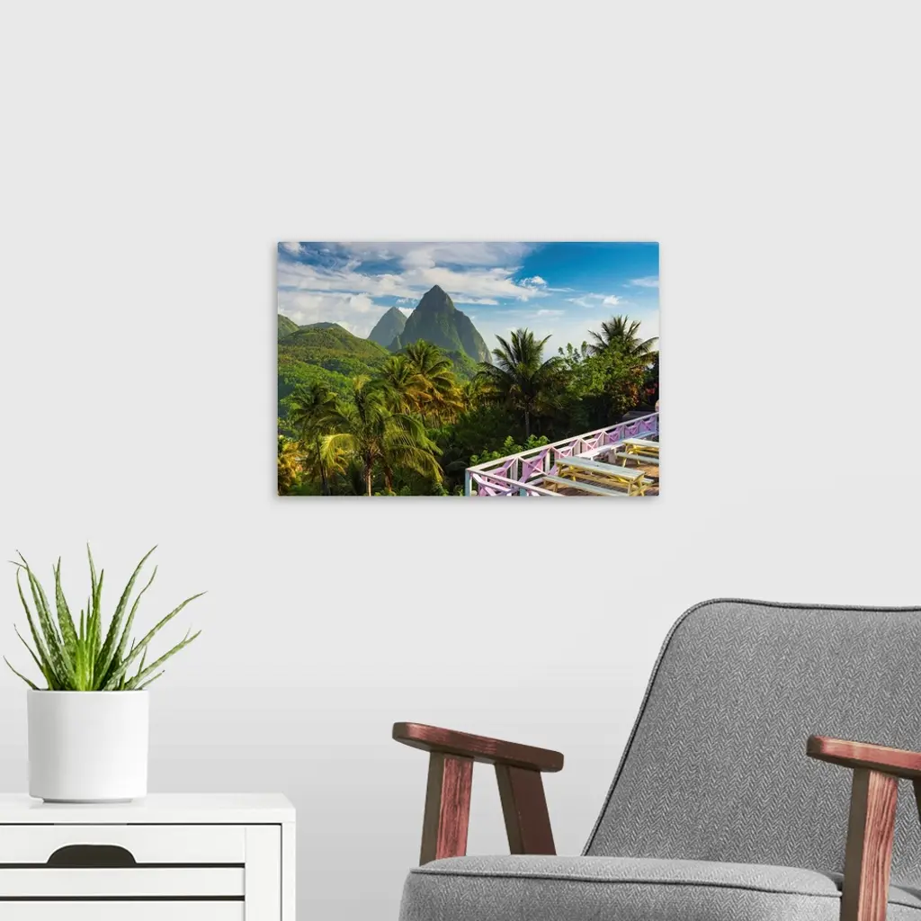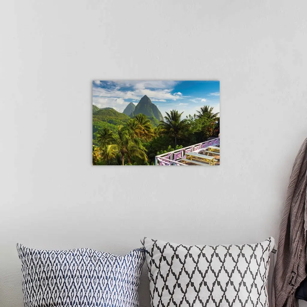 Caribbean, St Lucia, Petit (near) and Gros Piton Mountains (UNESCO World Heritage Site) above town of Soufriere, from La Haut Hotel and Resort