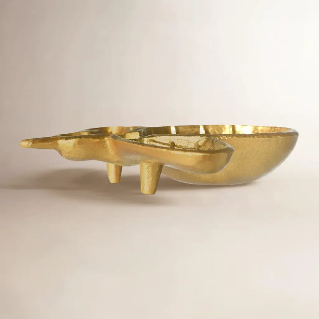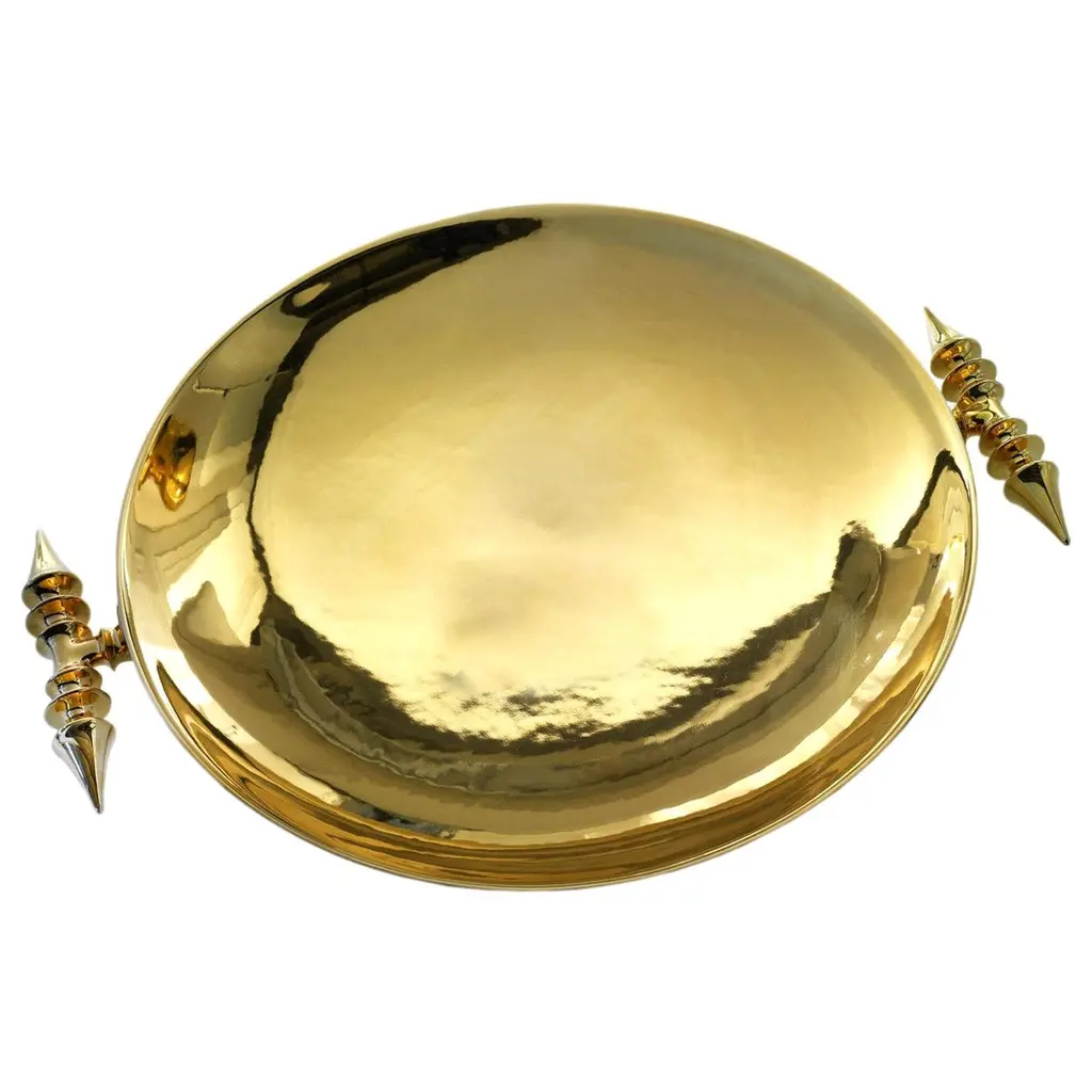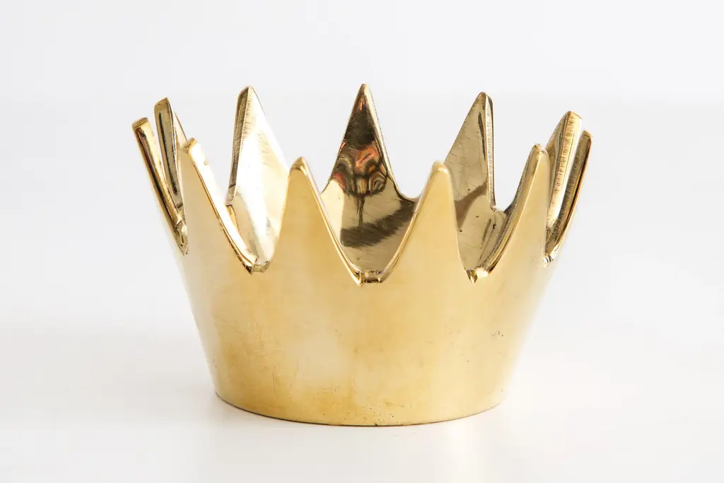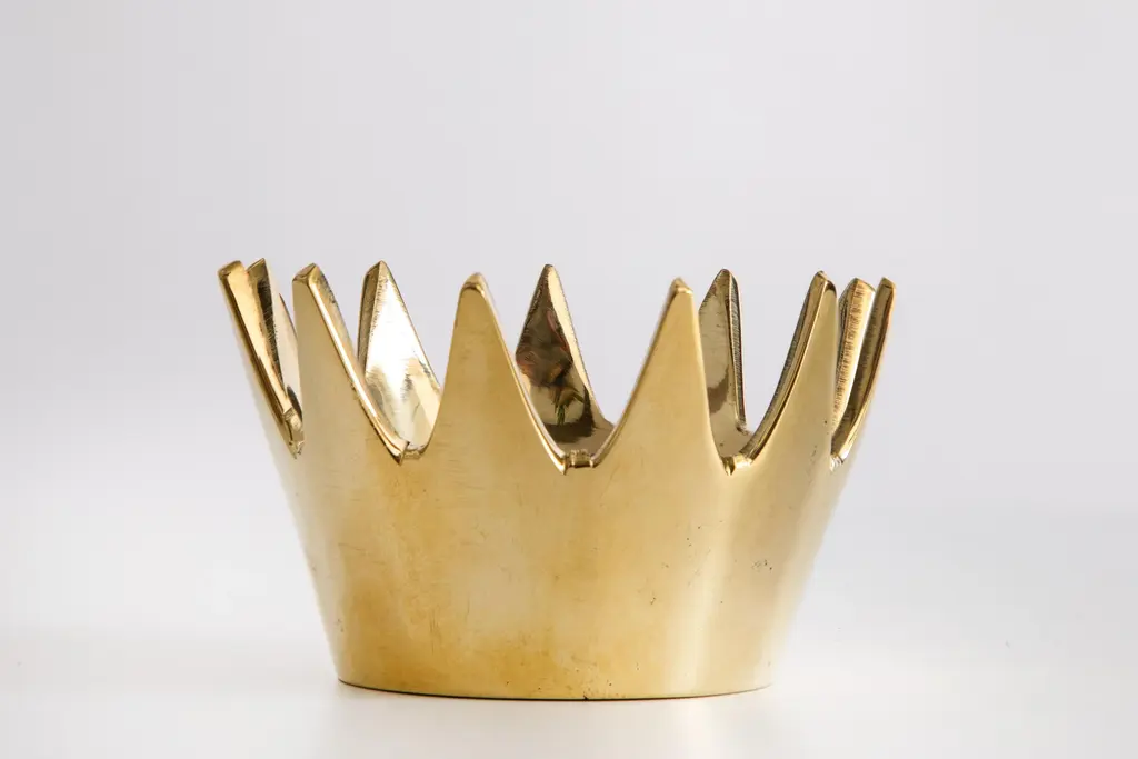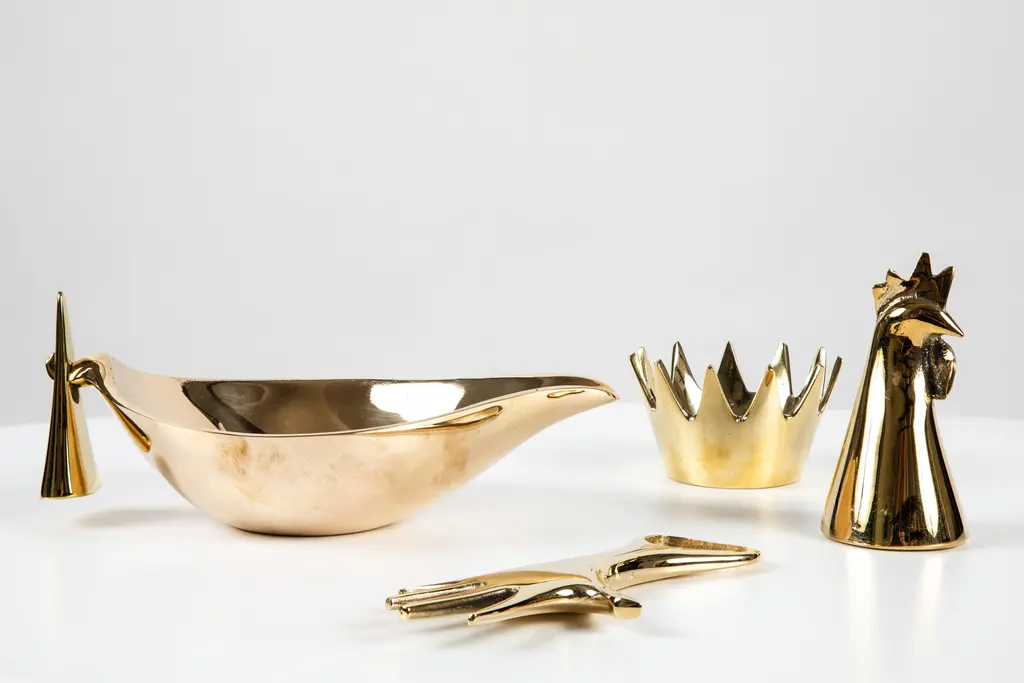 Set of four Carl Auböck brass objects. Includes Carl Aubock model #4272-2 'Rooster' brass bell, model #3600 'Crown' brass bowl, model #3514 brass bowl and model #4224 'Hand' brass bottle opener. Designed in the 1950s, these incredibly refined and sculptural objects are executed in polished brass. Price is per set of four. One set in stock and ready to ship. Items also sold separately. Available in unlimited quantities. Can take up to 8 weeks. Produced by Carl Auböck IV in the original Auböck Werkstätte in the 7th district of Vienna using the same exacting standers, high-quality materials, original molds and techniques of his legendary grandfather. Auböck's design career was long and varied, reaching its pinnacle of prestige at the Triennale di Milano in 1954, where he received four gold medals in recognition of his iconic work. Finish varies from item to item due to the handmade nature of their fabrication. Available Now