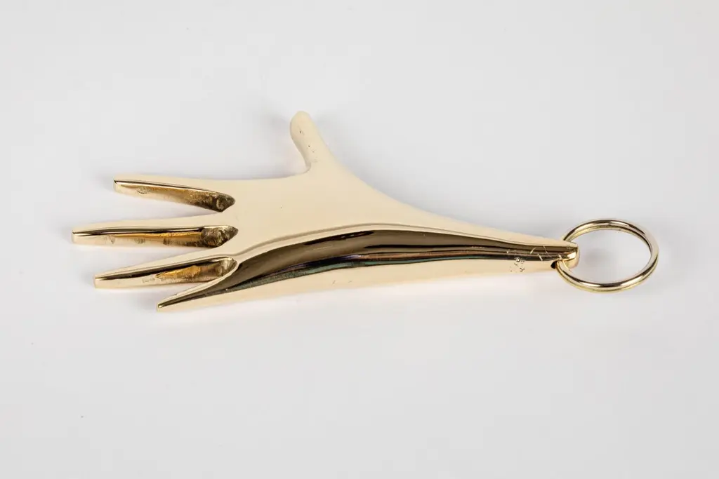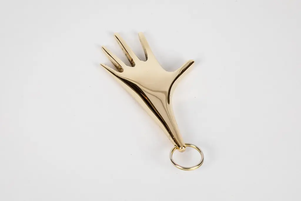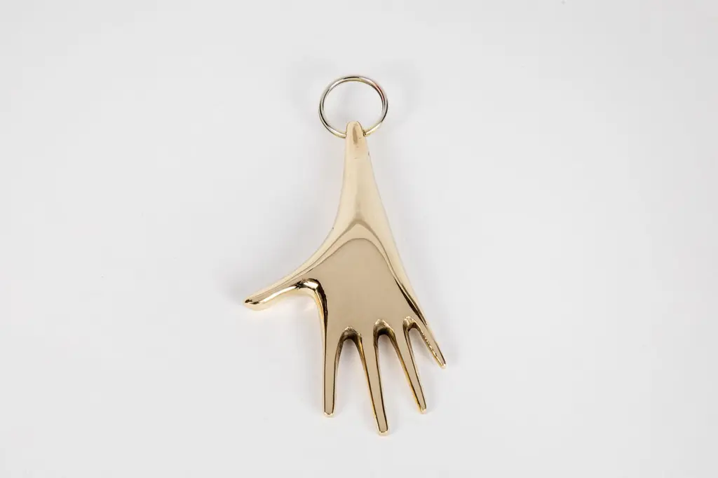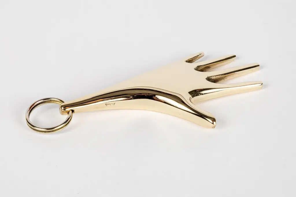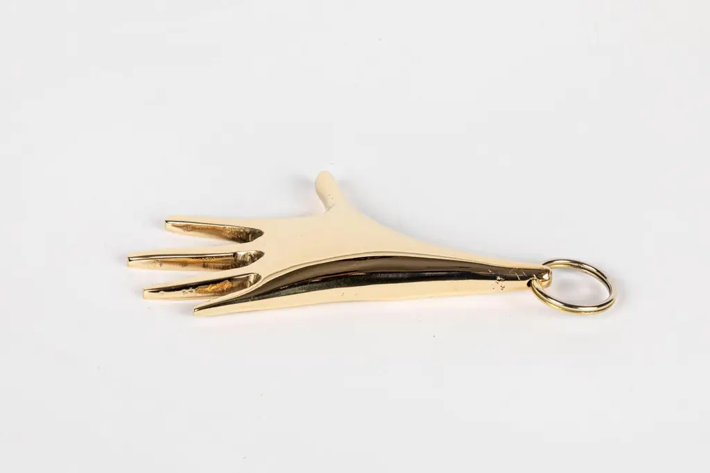 Carl Auböck model #5732 'Hand' brass figurine keyring. Designed in the 1950s, this incredibly refined and sculptural object is hand fabricated in polished brass. Price is per item. On in stock ready to ship. Available in unlimited quantities. Please note that in-stock availability is subject to change at any time. Allow additional 3-4 weeks for items not in stock. Can take up to 8 weeks. Produced by Carl Auböck IV in the original Auböck Werkstätte in the 7th district of Vienna using the same exacting standards, high-quality materials, original molds and techniques of his legendary grandfather. Auböck's design career was long and varied, reaching its pinnacle of prestige at the Triennale di Milano in 1954, where he received four gold medals in recognition of his iconic work.Please note that only one representative example of each item is shown in the images. Finish varies from item to item due to the handmade nature of their fabrication.