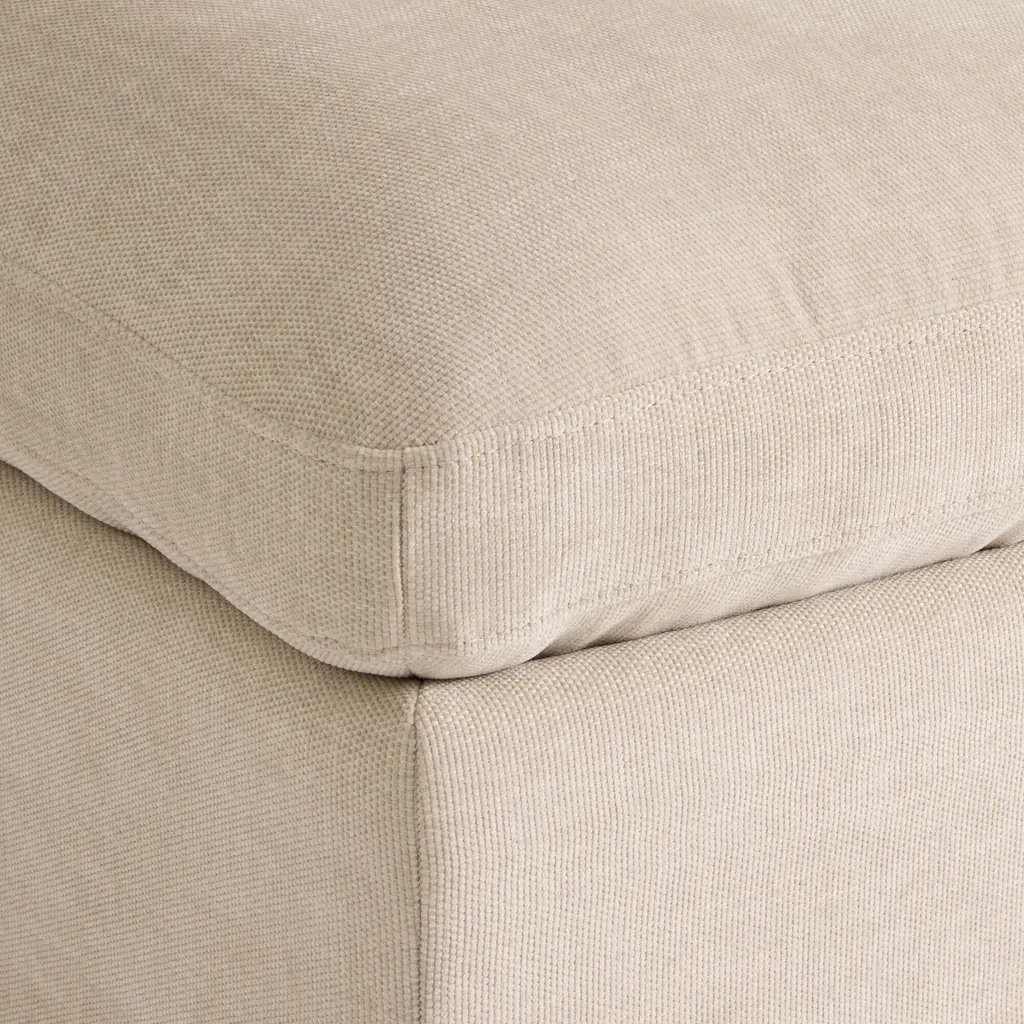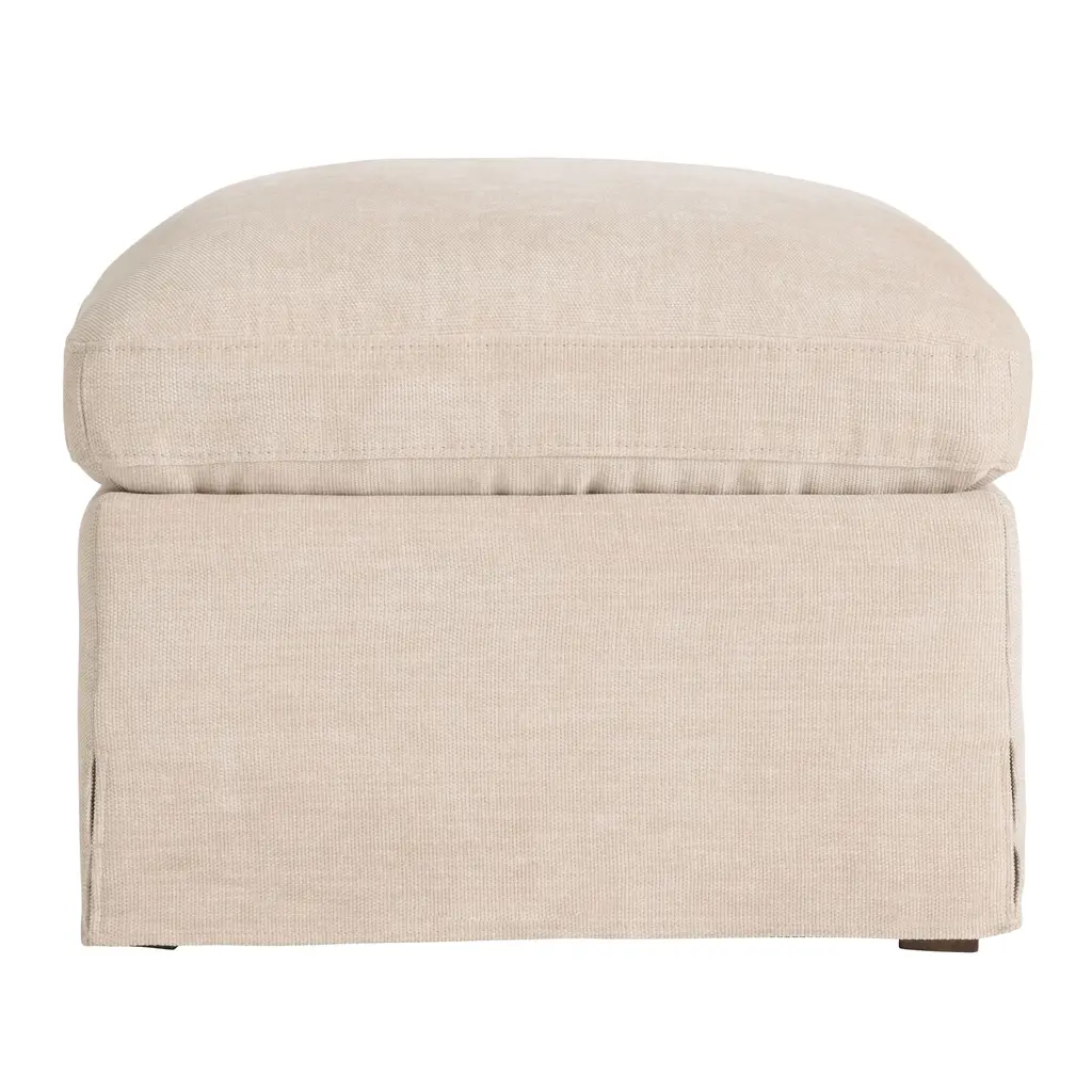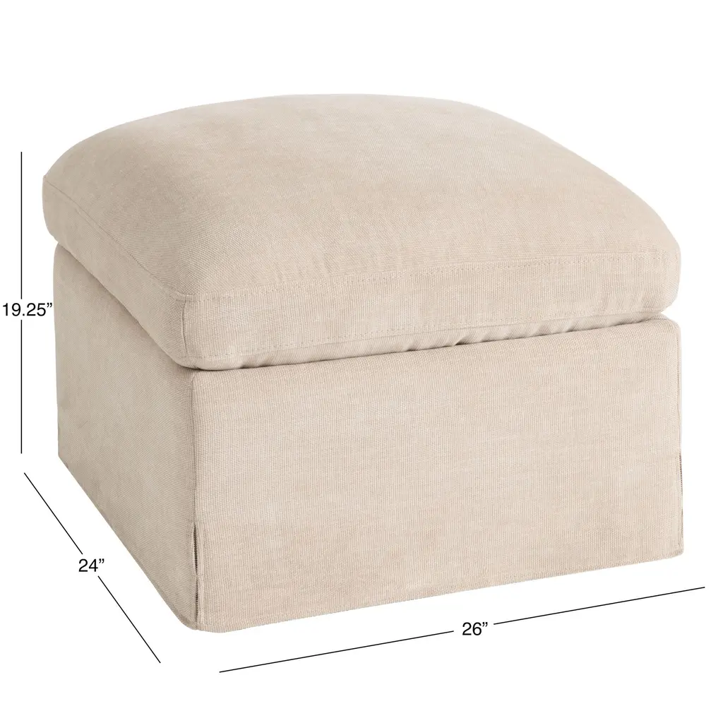 Tailored with textural upholstery in an ivory and tan mélange, our large ottoman is styled with the skirted base of a faux slipcover to match our Carlyle sofa. Topped with the wonderful sink-in comfort of a plush cushion, this versatile ottoman is a sumptuous chaise-like footrest for its companion couch. At home in any setting from traditional to contemporary, this accent stool will stand proudly on its own as an elegant extra seat.