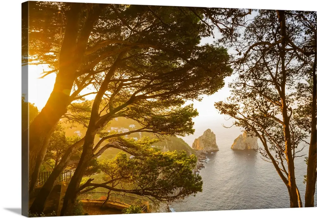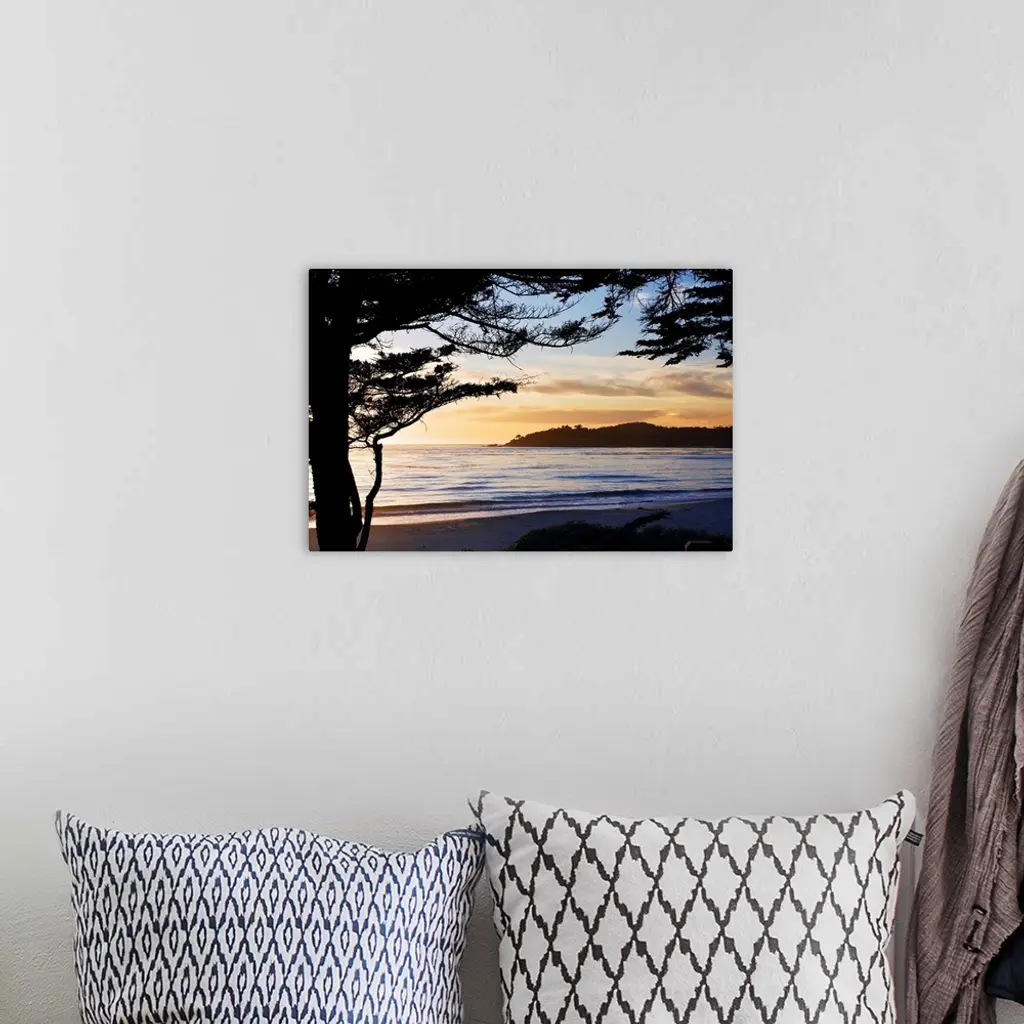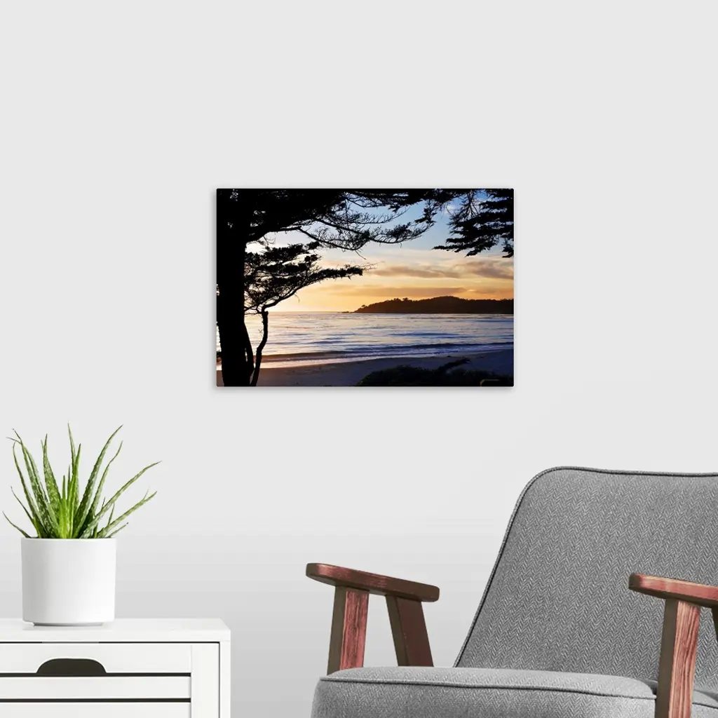 This landscape photograph of waves rocking against the seashore and the silhouette of a beach pine tree in the foreground captures a sunset in a horizontal wall hanging.