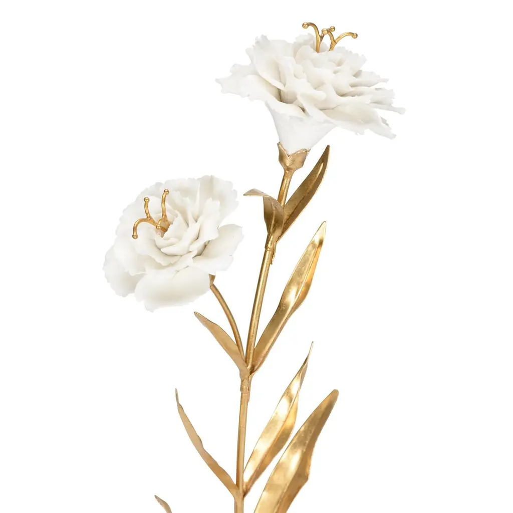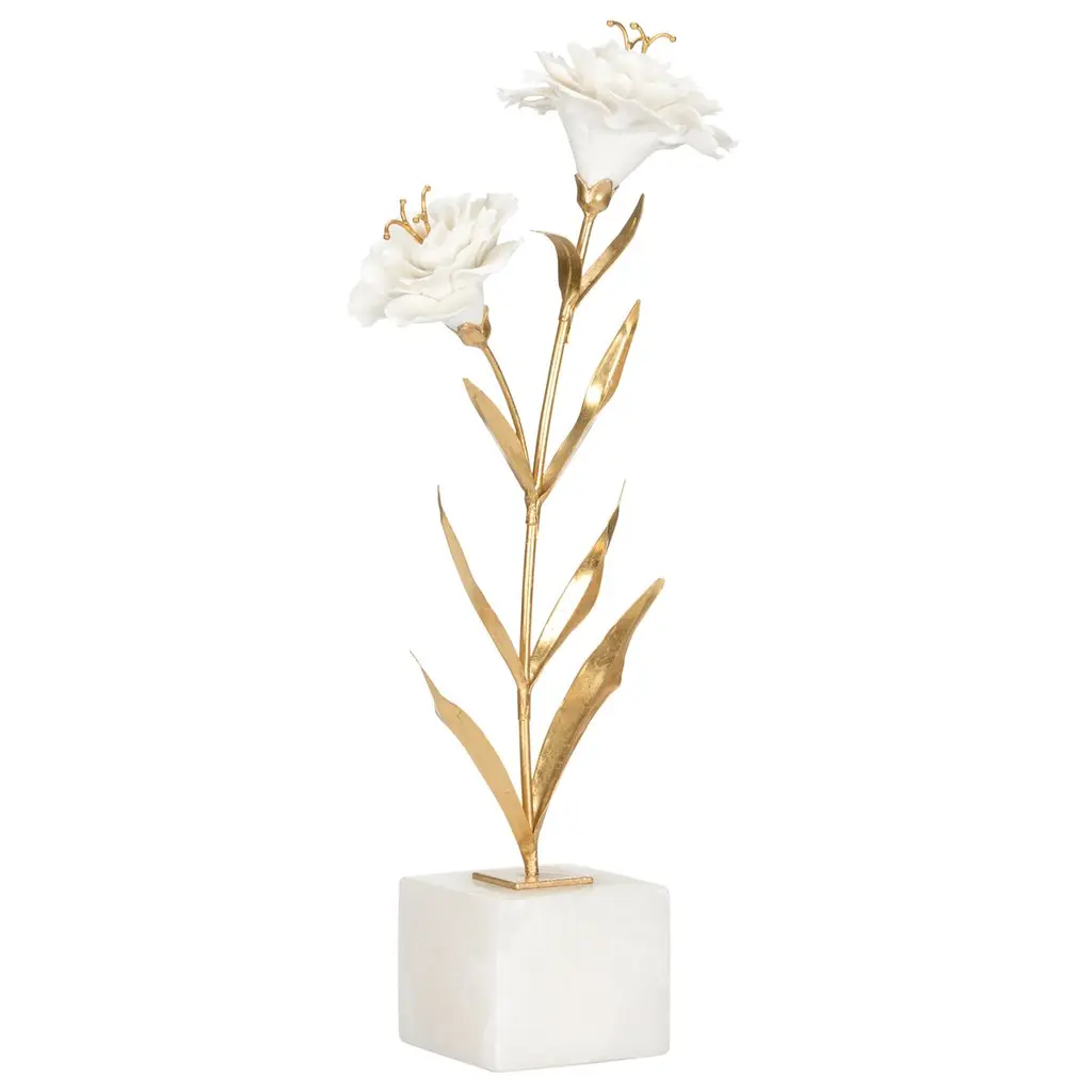 The Carnation on Alabaster Stand features delicate white porcelain flowers with a gold stem, elegantly set on a square alabaster base. A beautiful decorative accent blending timeless charm with modern elegance.