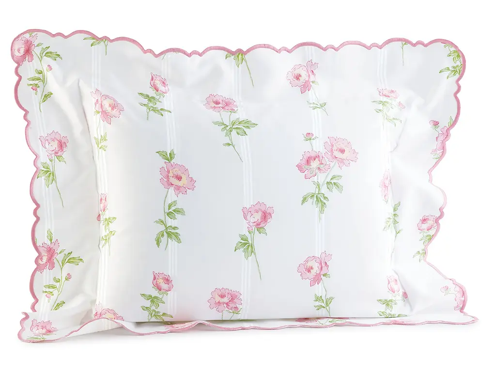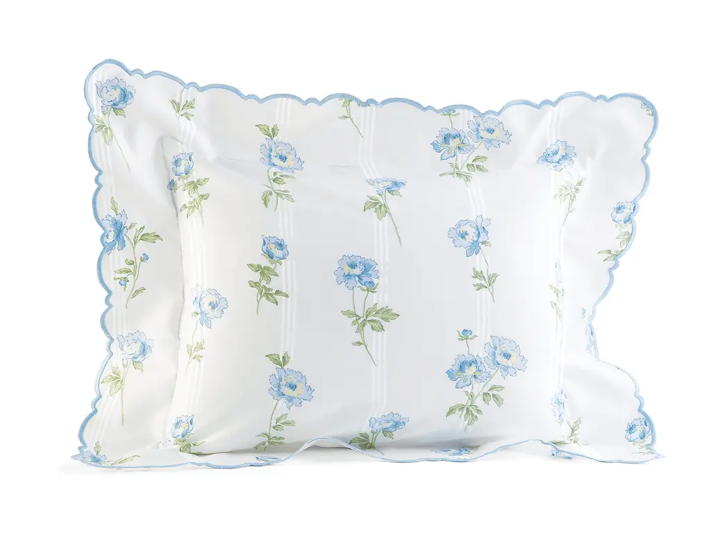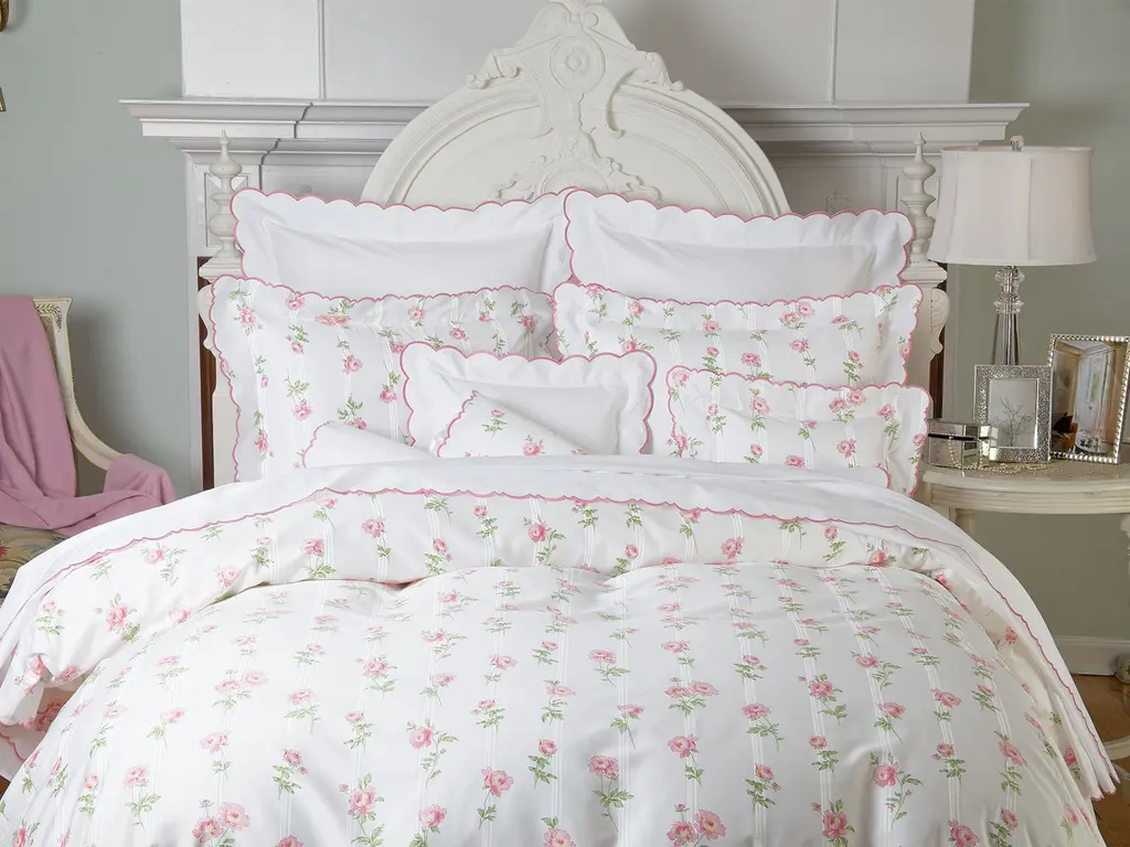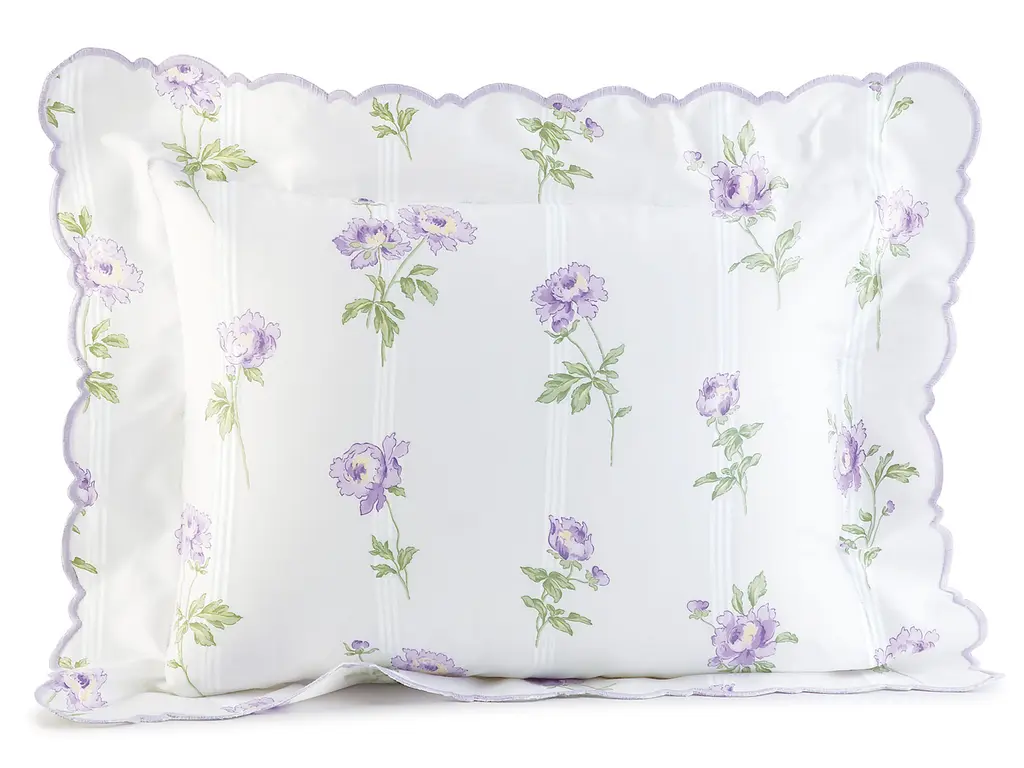 Designed exclusively for our customers, enchanting Blue, Pink or Lavender print blossoms grow row upon row amid printed trellis stripes of White on White Egyptian cotton sateen, 300 thread count. Crafted in Italy with the artfulness and expert tailoring you expect from them and us, the exquisite details include distinctive edges of embroidered scallops.