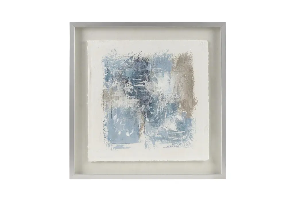 Esoteric Collection by artist Carol Benson-Cobb features ephemeral shades of white and blue on watercolor paper. The piece is held within a white floater frame contained within a clear acrylic box. This piece is available in only one size (24X24) and offered in the Acrylic Box only.
