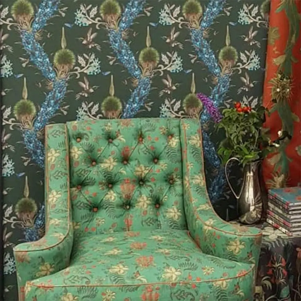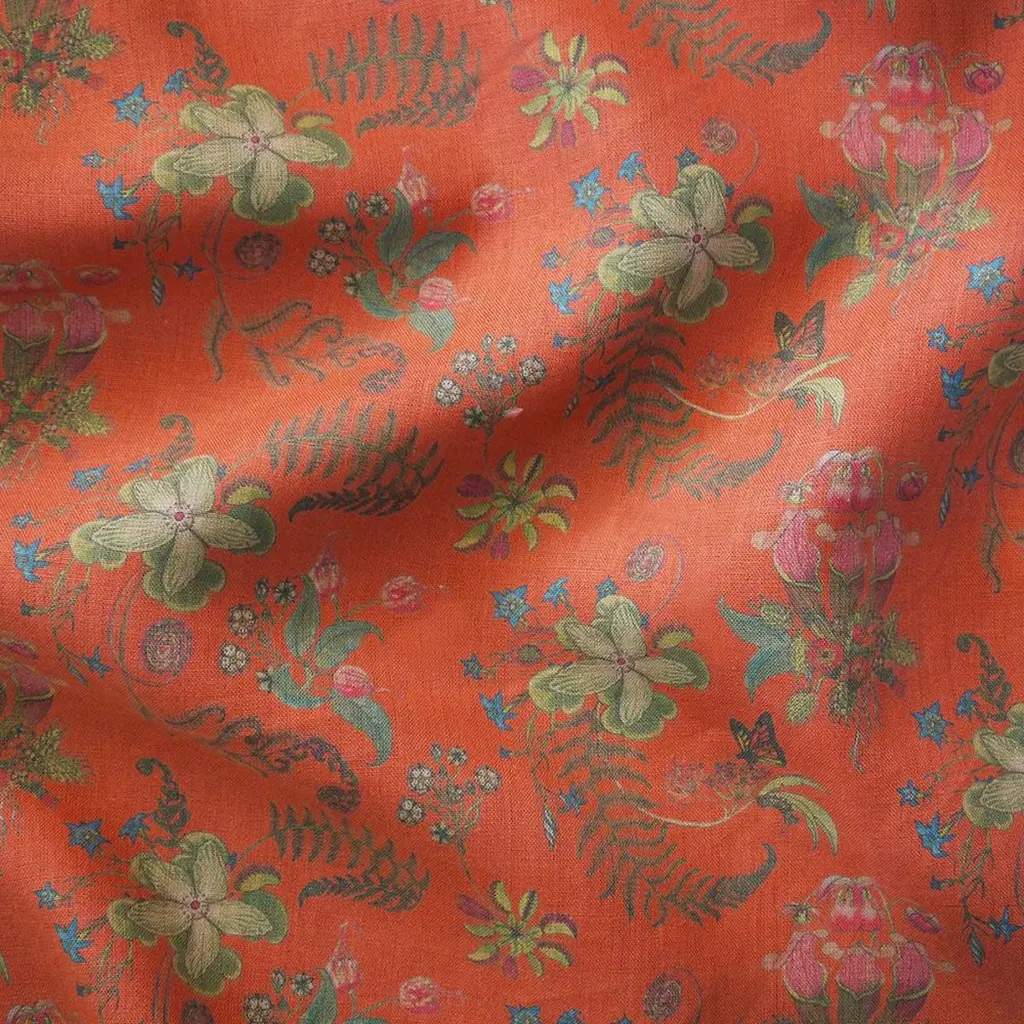 Carolina Posies is a lush, hand-drawn design which celebrates wild species of the Southern States of the Carolinas. The designer is a conservation biologist who grew up in this beautiful area. The rich colors and graphic details are matched by the interest of the many extraordinary species depicted, including monarch butterflies and their larval food plants, milkweed, Carolina Reaper chilli peppers, devil's paintbrush, pine barren gentian, grass of Parnassus and carnivorous plants.Carolina Posies is a detailed botanical with an enchanting meandering feel, part of a growing passion in interiors for honoring the natural world. Furthermore, for every roll of metre of fabric sold, 100m2 of critical wild Habitat is preserved through World Land Trust.Collection: Carolina PosiesProduct code: 26DColor: SarsaparillaCollection: Carolina tree of lifeProduct code: 25CFabric type: 100% linen woven and printed in the UKThese designs are available on medium weight linen of 250 g or a heavyweight 450 g bleached or natural linenOther ground colors availableUsage: Drapery and light upholsteryCare: Dry clean onlyPattern repeat: Half dropHorizontal/Vertical repeat: 6.75" x 13.5" (17.15 cm x 34.3 cm)Printed width of fabric: 54" (137.2 cm)Samples available.
