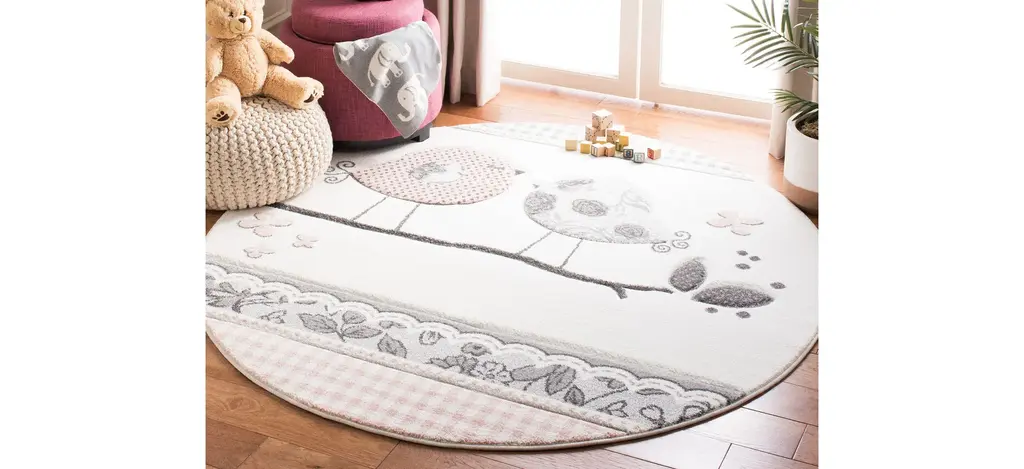 The Carousel Birds Kids Area Rug Round turns fanciful storybook animals and beloved motifs into colorful decor for kids. With pleasing hues and playful etched designs, these delightful kid's rugs sparkle in children's favorite rooms. Carousel Kids rugs are power-loomed using soft yet durable synthetic yarns for lasting beauty even when subjected to years of busy little feet.