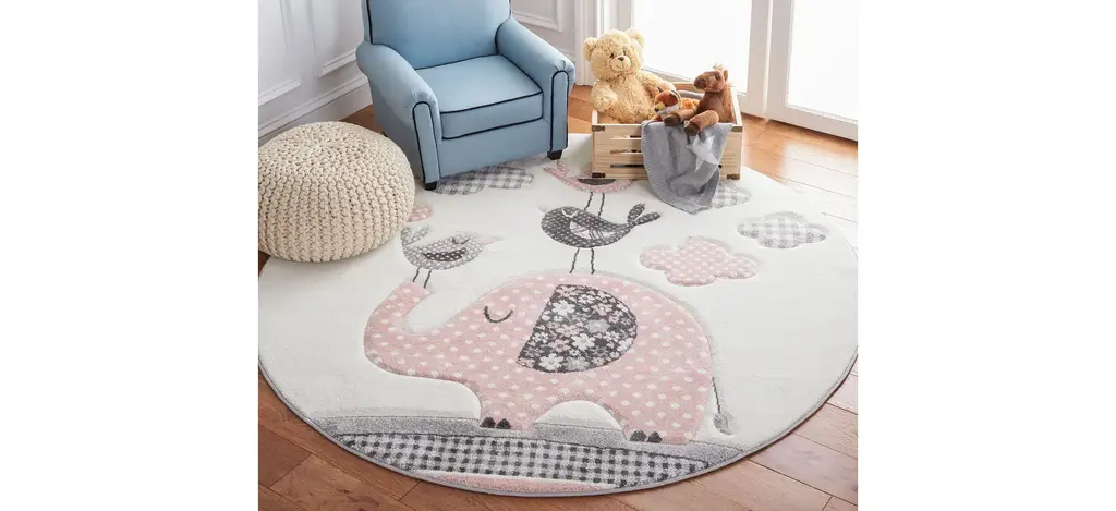 The Carousel Elephant Kids Area Rug Round turns fanciful storybook animals and beloved motifs into colorful decor for kids. With pleasing hues and playful etched designs, these delightful kid's rugs sparkle in children's favorite rooms. Carousel Kids rugs are power-loomed using soft yet durable synthetic yarns for lasting beauty even when subjected to years of busy little feet.