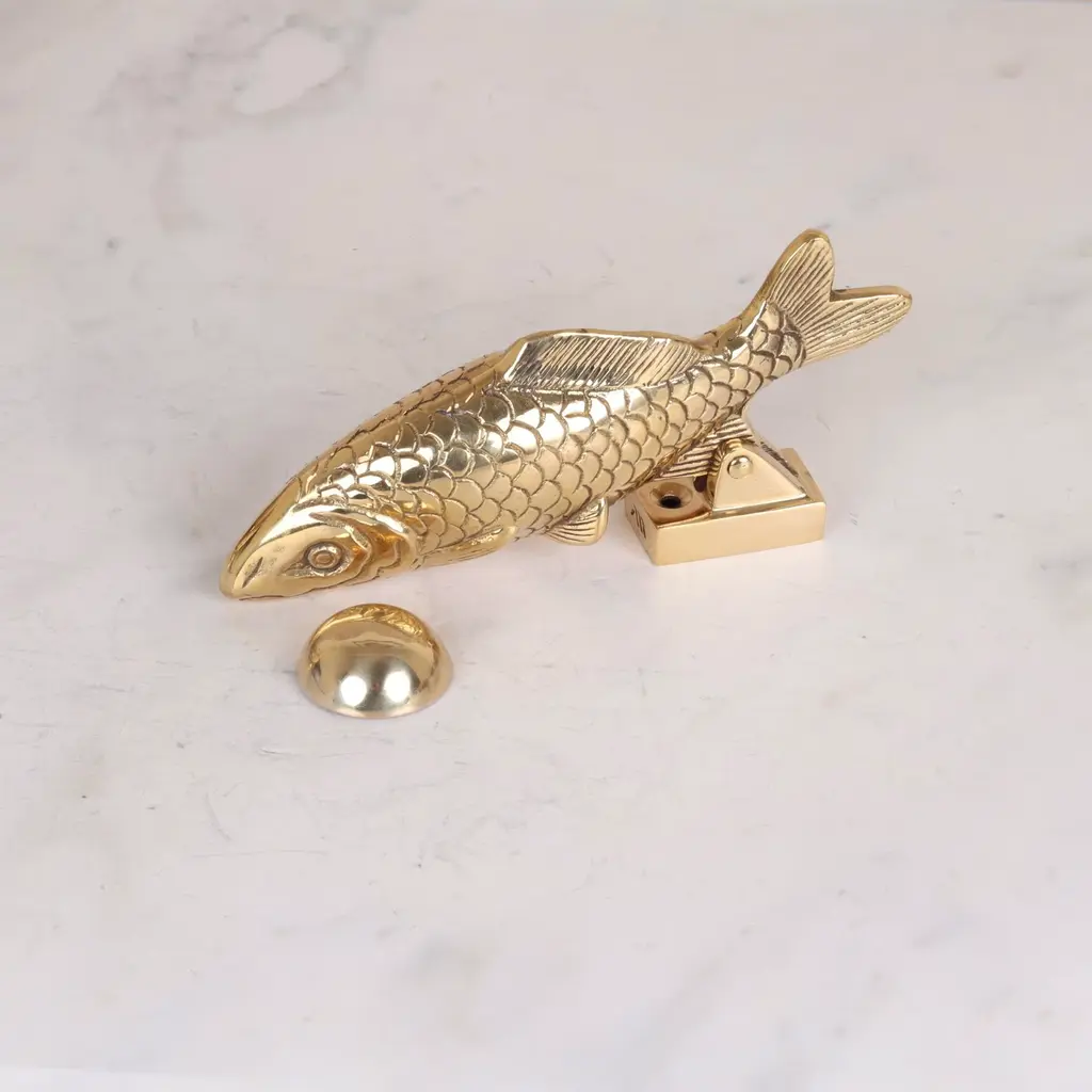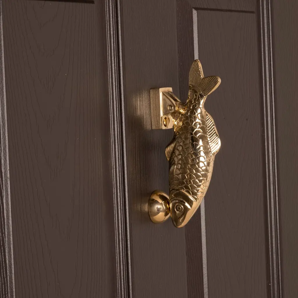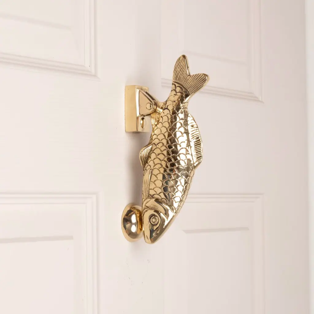 This solid brass carp door knocker has a striking downward-facing pose, with the fitting attached at the fin so the full body is visible to approaching visitors. Weighing just over half a kilo, it’s the perfect shape and size to hold, with a satisfying knock. With beautifully detailed fins and scale pattern, it is both decorative and functional—a thoughtful gift for coarse fishing enthusiasts or a charming addition to any home. Each door knocker is handcrafted using traditional techniques and engraved with the maker’s mark. Fixings included. Presented in a wooden gift box with a branded dust bag. Other finishes available—see our website for details.