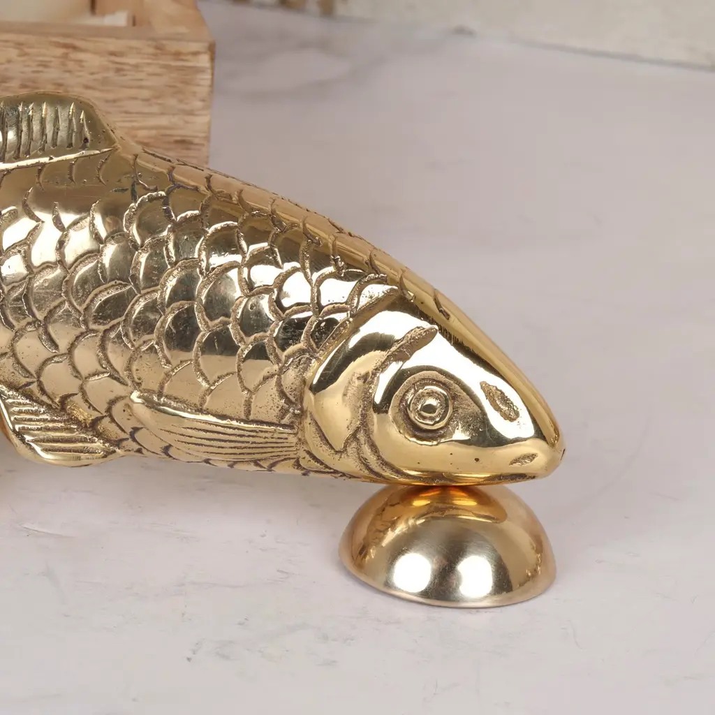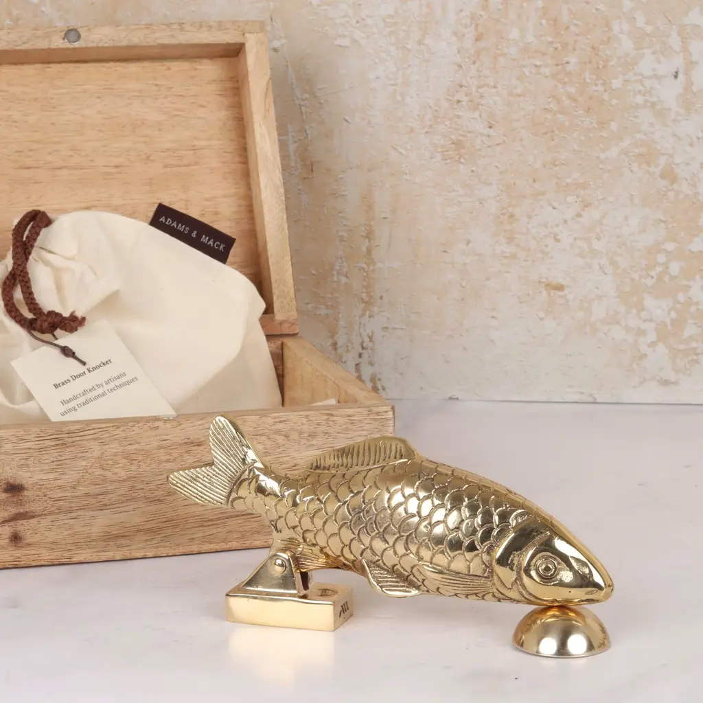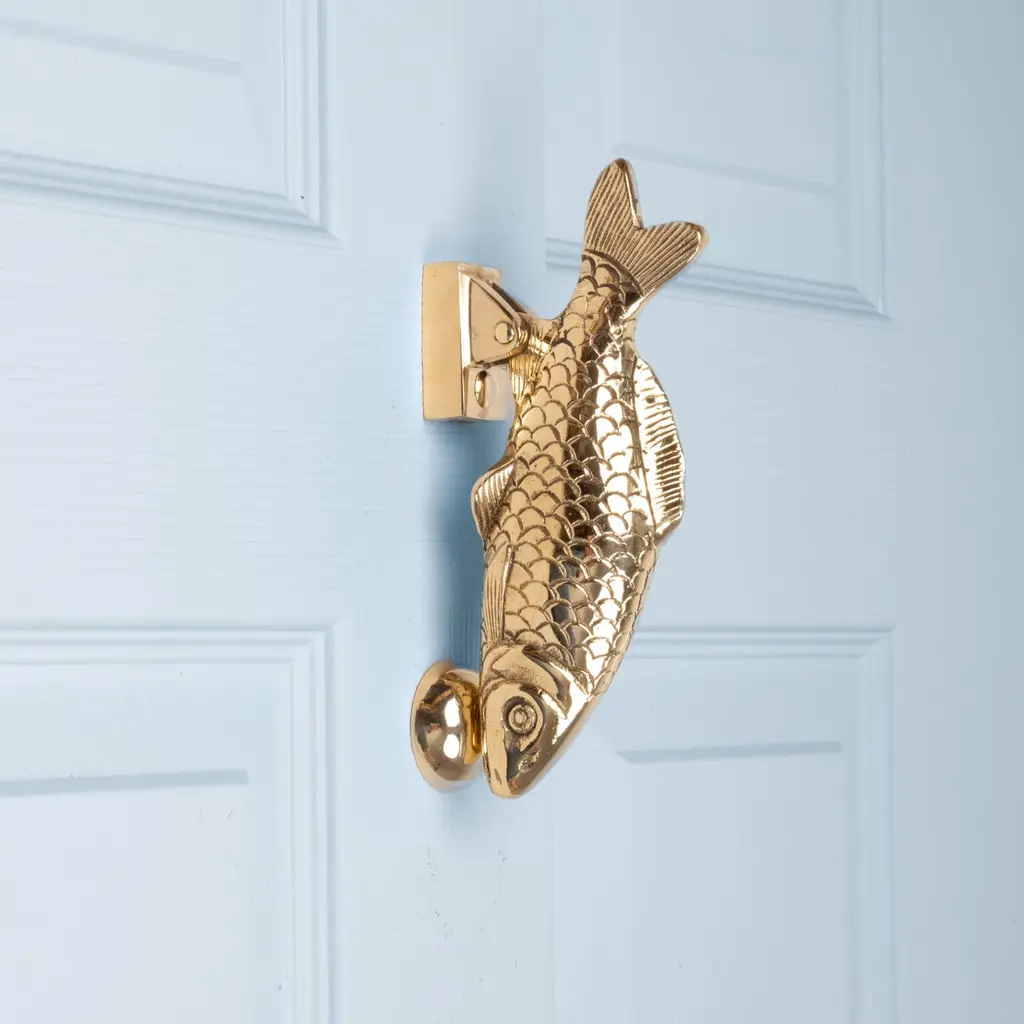 This solid brass carp door knocker has a striking downward-facing pose, with the fitting attached at the fin so the full body is visible to approaching visitors. Weighing just over half a kilo, it’s the perfect shape and size to hold, with a satisfying knock. With beautifully detailed fins and scale pattern, it is both decorative and functional—a thoughtful gift for coarse fishing enthusiasts or a charming addition to any home. Each door knocker is handcrafted using traditional techniques and engraved with the maker’s mark. Fixings included. Presented in a wooden gift box with a branded dust bag. Other finishes available—see our website for details.