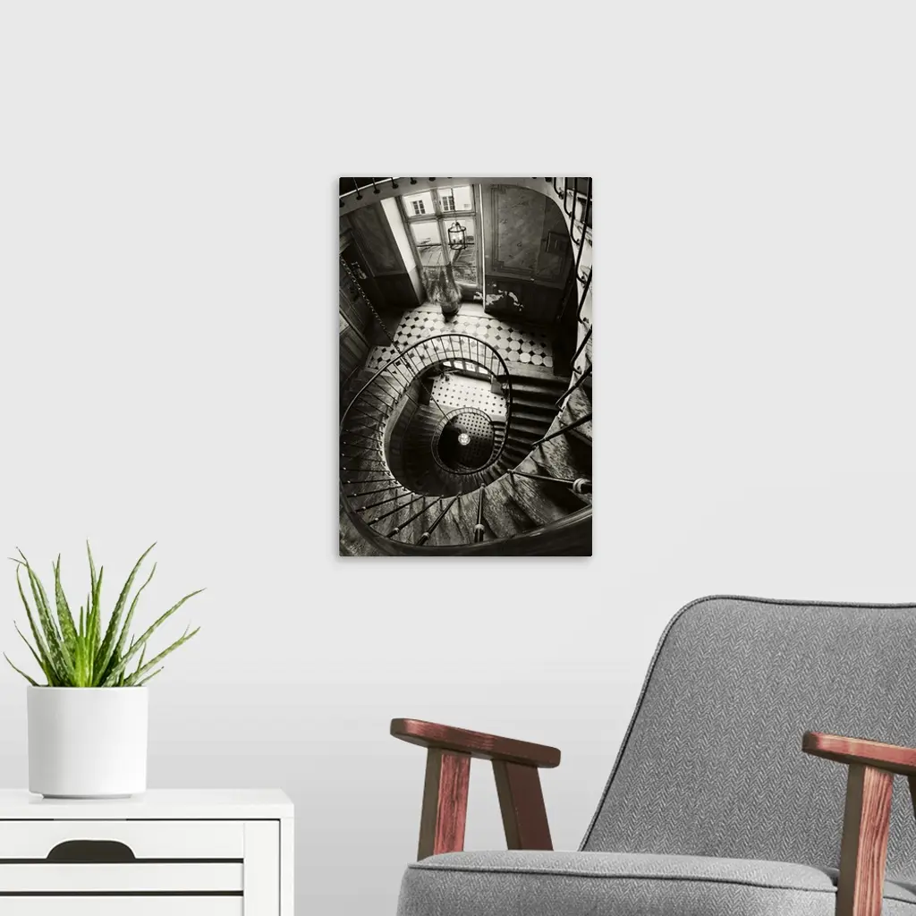 View through the center of a spiral staircase in Paris.