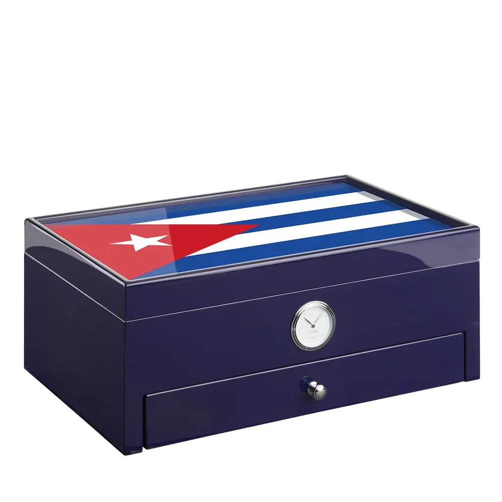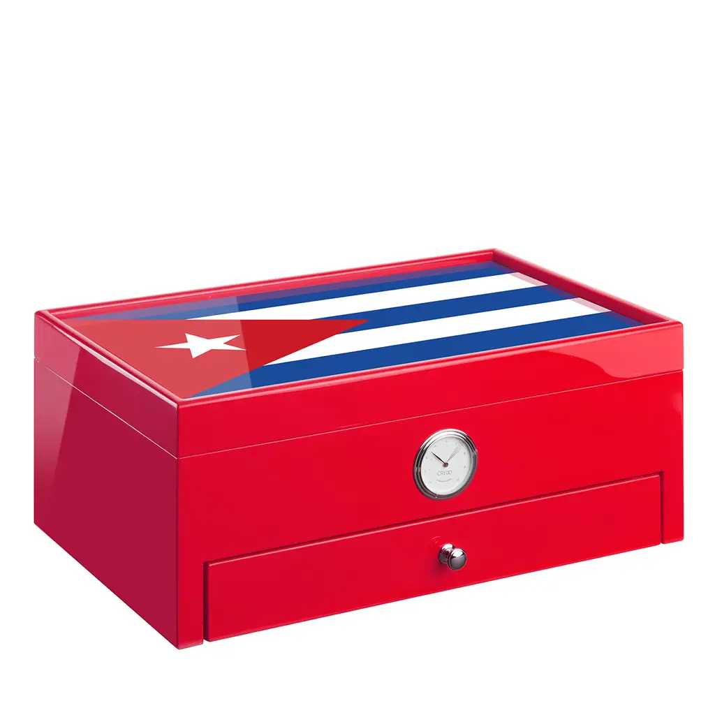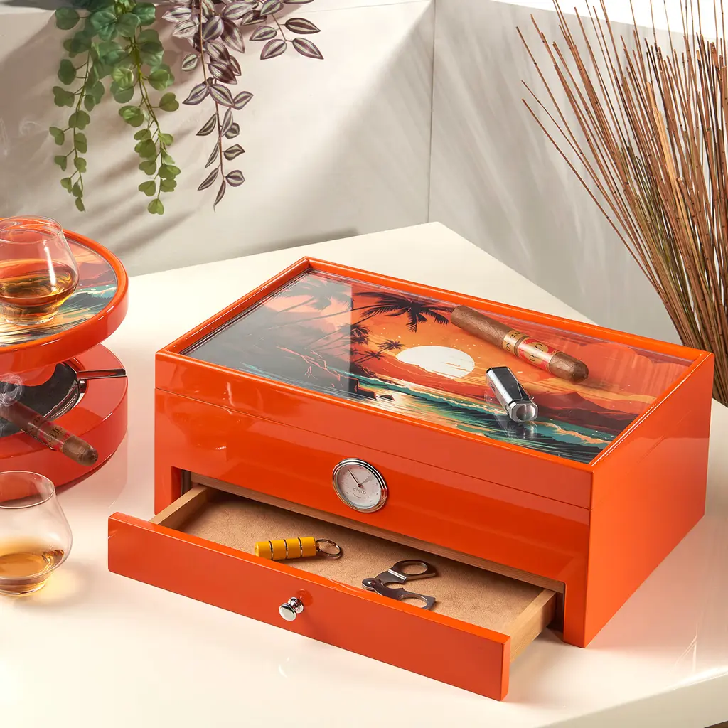 Crafted from varnished wood with an extra glossy finish and a captivating printed glass panel, this Caribbean-inspired humidor maintains optimal humidity with its cedar wood lining. Featuring a cedar-lined drawer with a removable Alcantara insert, it offers versatile storage also for other smoking accessories. With two removable cedar wood separators and an analog hygrometer, it can hold up to 100 cigars.