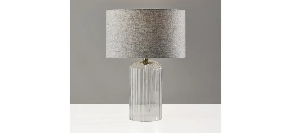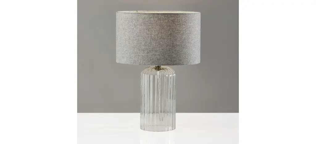 Add a blend of contemporary and coastal style to your home with the Carrie table lamp. With a base of ribbed glass offset by an antique finished neck, the stylish design is completed by the drum-shaped soft-touch fabric shade. It features a rotary socket switch to easily turn the lamp on or off, and with a 5' long cord, this lamp powers a 60W Type A bulb (sold separately). While this lamp is 16.5" tall and 12" wide, complete your home's decor with the larger Carrie table lamp measuring 22" tall and 14.5" wide.