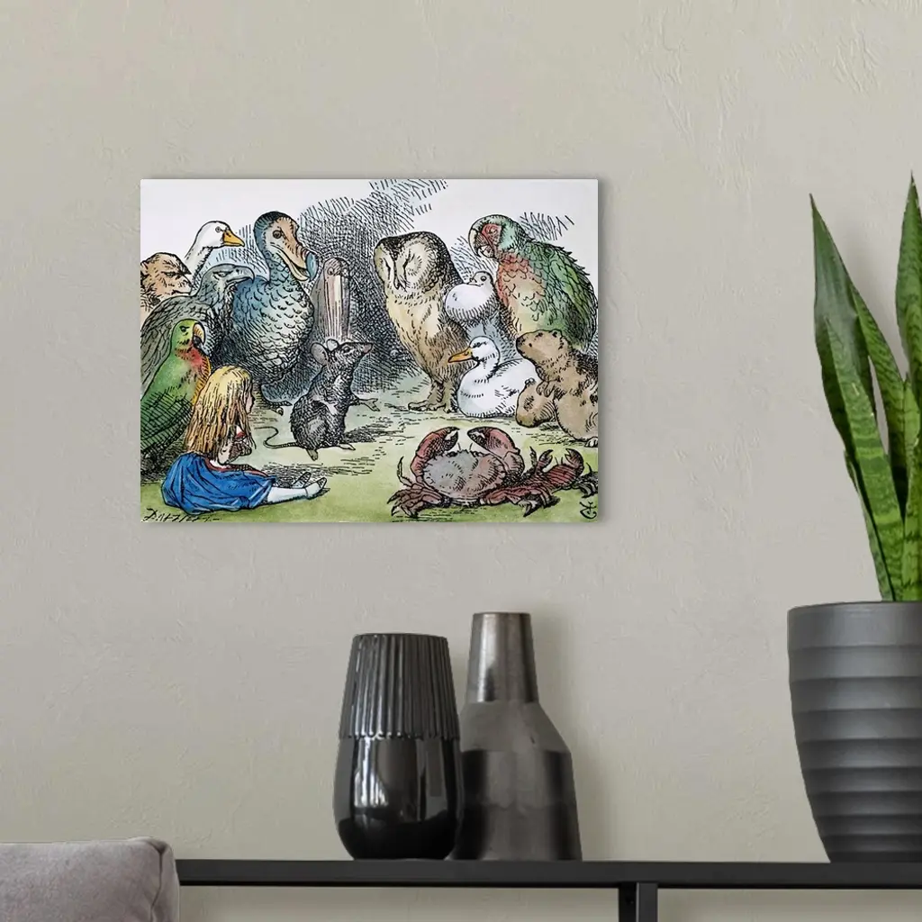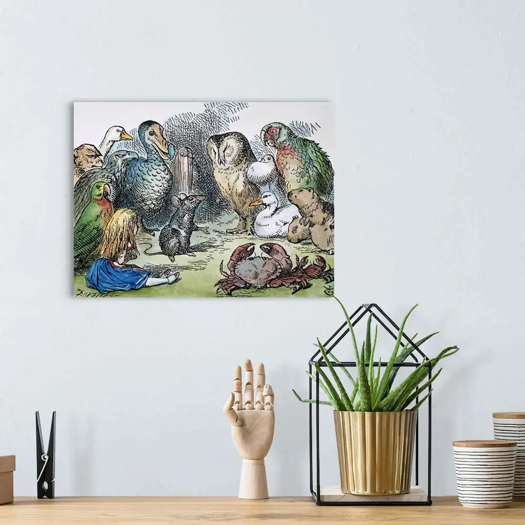 All the birds and animals 'sat down at once': after the design by Sir John Tenniel for the first edition of Lewis Carroll's Alice's Adventures in Wonderland.
