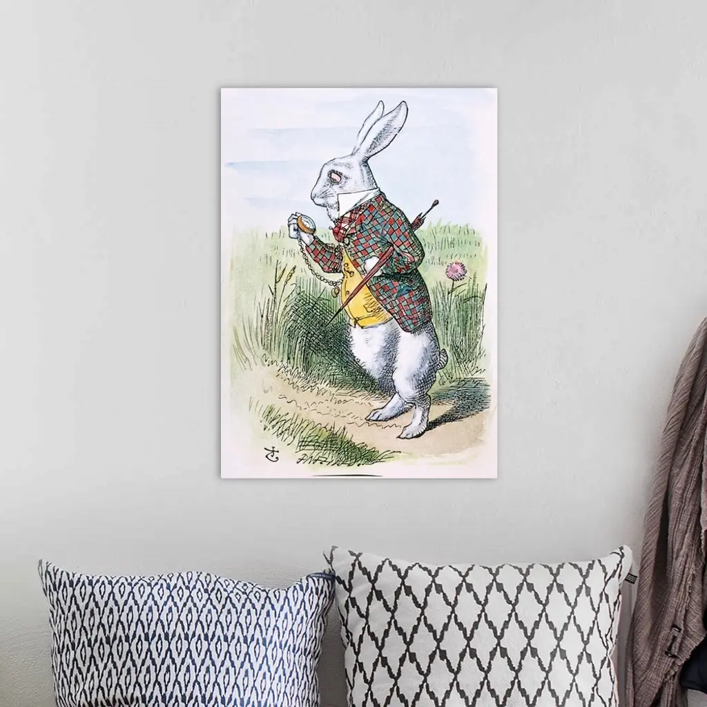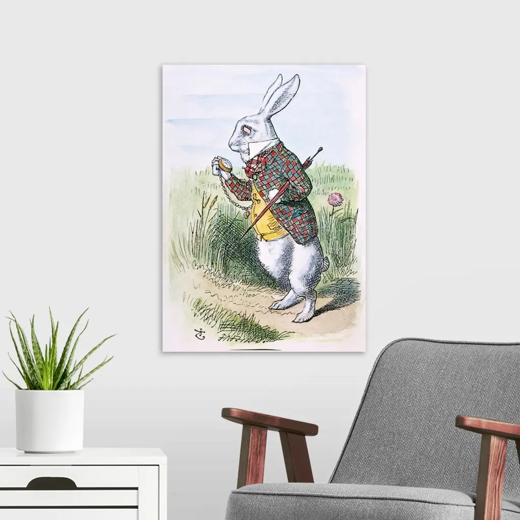 The White Rabbit observing that he shall be too late after the design by Sir John Tenniel for the first edition, 1865, of Lewis Carroll's Alice's Adventures in Wonderland.