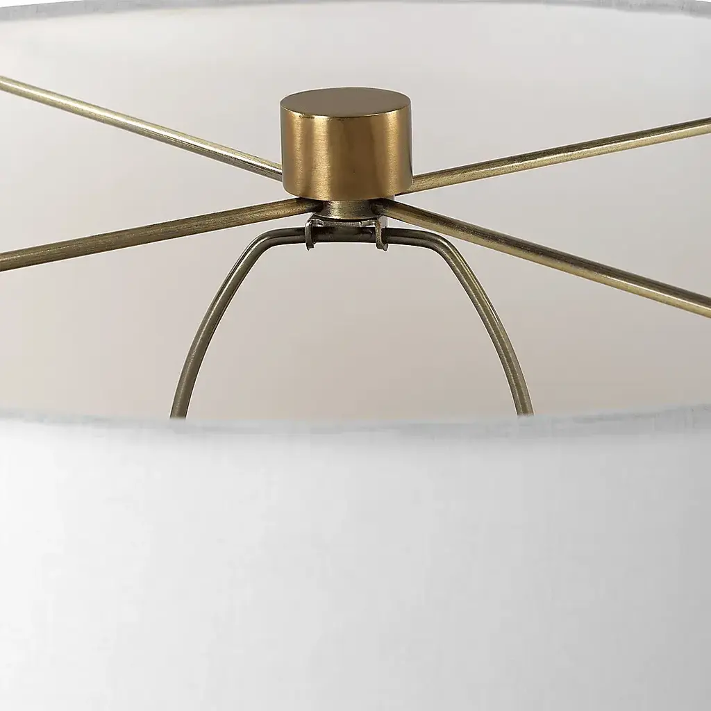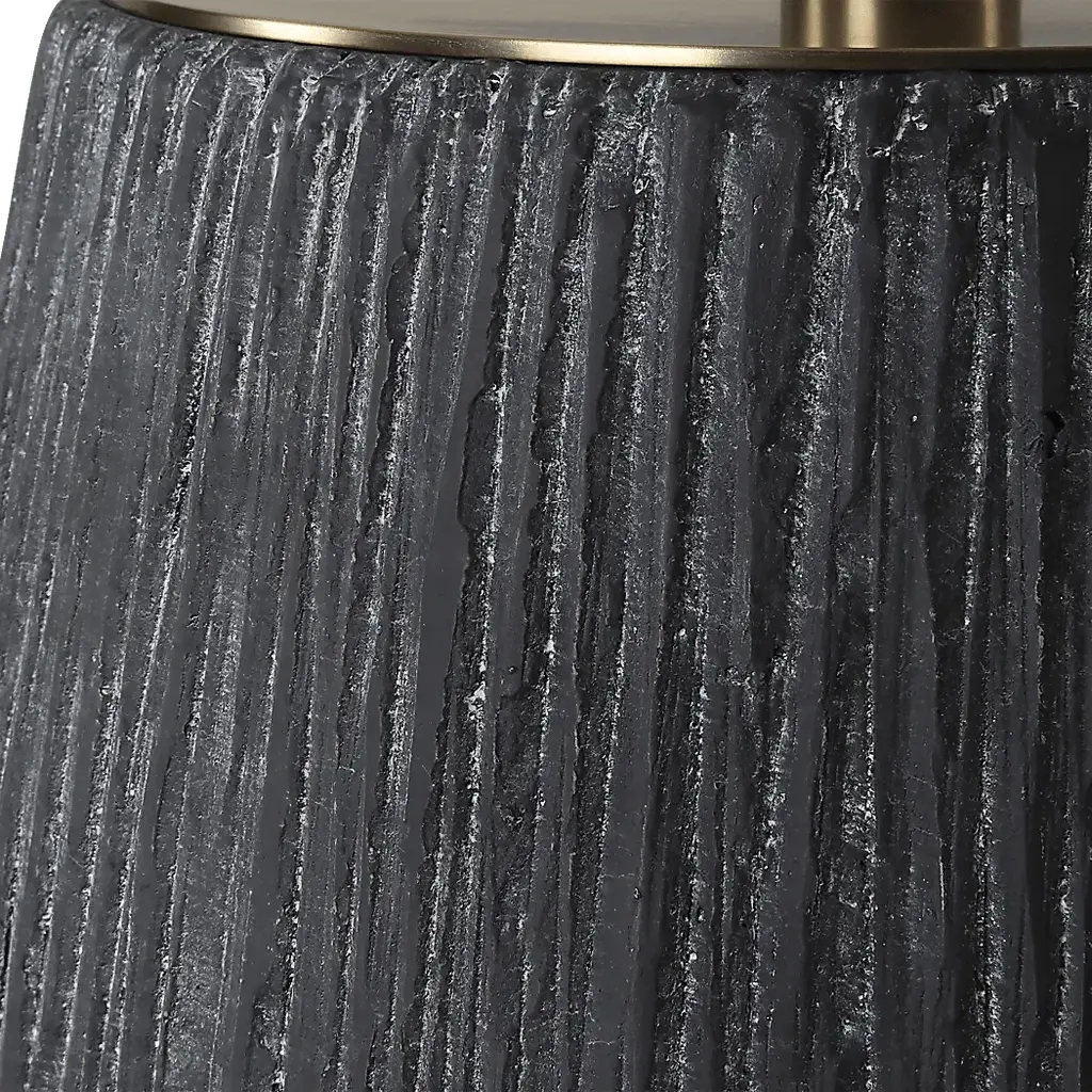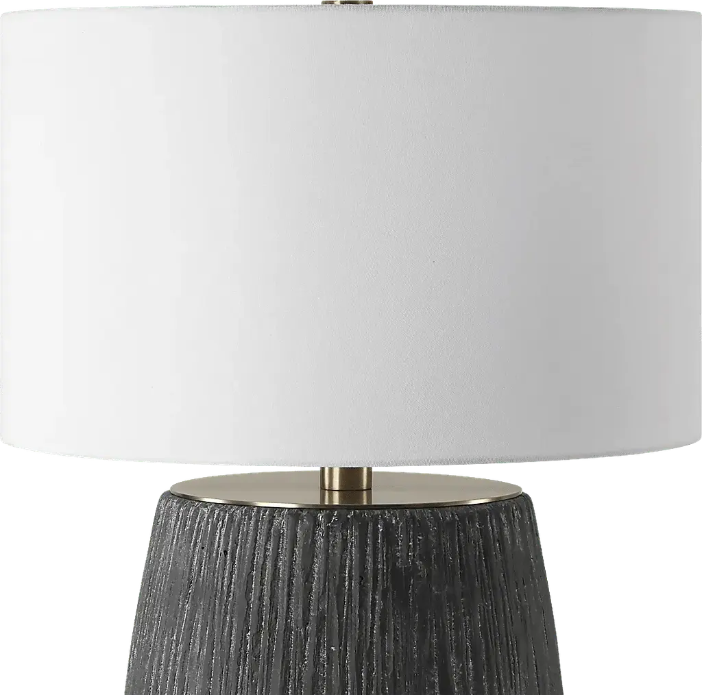 The Carten Post Black Lamp features a concrete base with deep organic texturing finished in an aged black with light gray antiquing, accented with brass plated details. The round hardback drum shade is a casual white linen fabric. Partial assembly may be required.