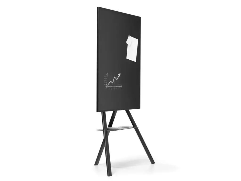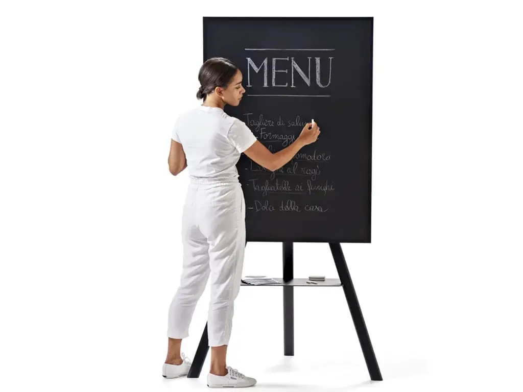 Cartesio, the steel trestle for special magnetic boards is the answer to these reflections, to give room to our imagination. Impeccable in black, essential in white, especially stylish in gold leaf, Cartesio is ideal for both education and leisure. With Cartesio you can show complicated mathematical graphs, fascinating mood boards, stunning keywords, or delicious menus of the day. Ideas that find space on a special magnetic writing board that can be white for colored markers or black to use with the chalks of our childhood. Whether in education and training institutes, bars and restaurants, conference centres or meeting rooms, Cartesio nurtures knowledge and style. Cartesio is available also without magnetic writing board.Technical features:Steel stand with built-in shelf for magnetic writing board. Structure finishes: matt - black or white. Glossy - gold leaf. Writing board versions: black for chalk, white for markers. Aluminium frame in matching colour. Notes: maximum weight capacity of shelf for appliances: 5 kg.
