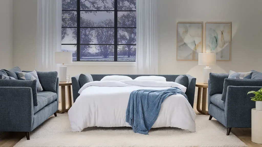 Bring home the iconic allure of mid-century modern design and a guest bed too, with the Caruso's splash of contemporary cool. Float this queen memory foam sleeper as the focal point of a living room to showcase its tailored all-around indigo hue, or pair it with other pieces in this collection for a timeless look that's truly transformative.