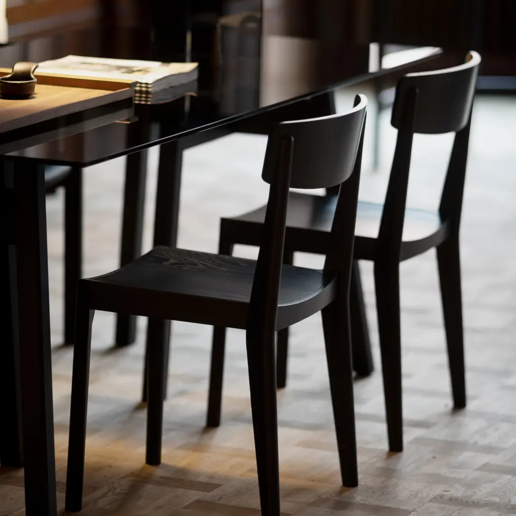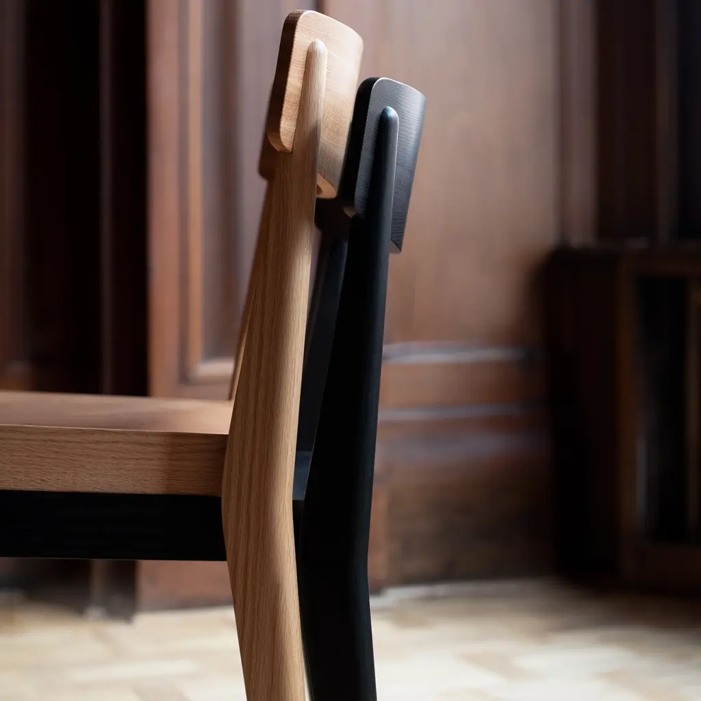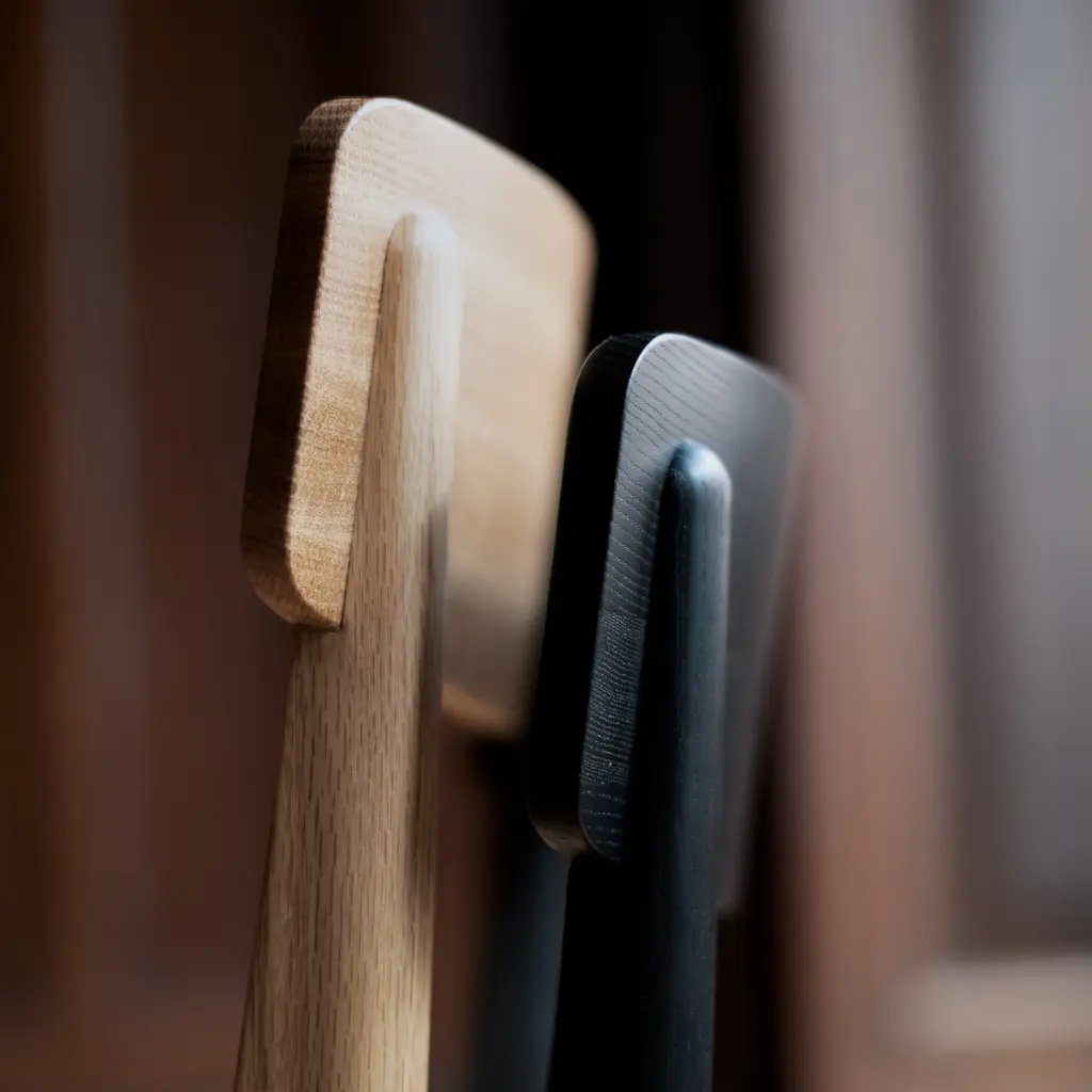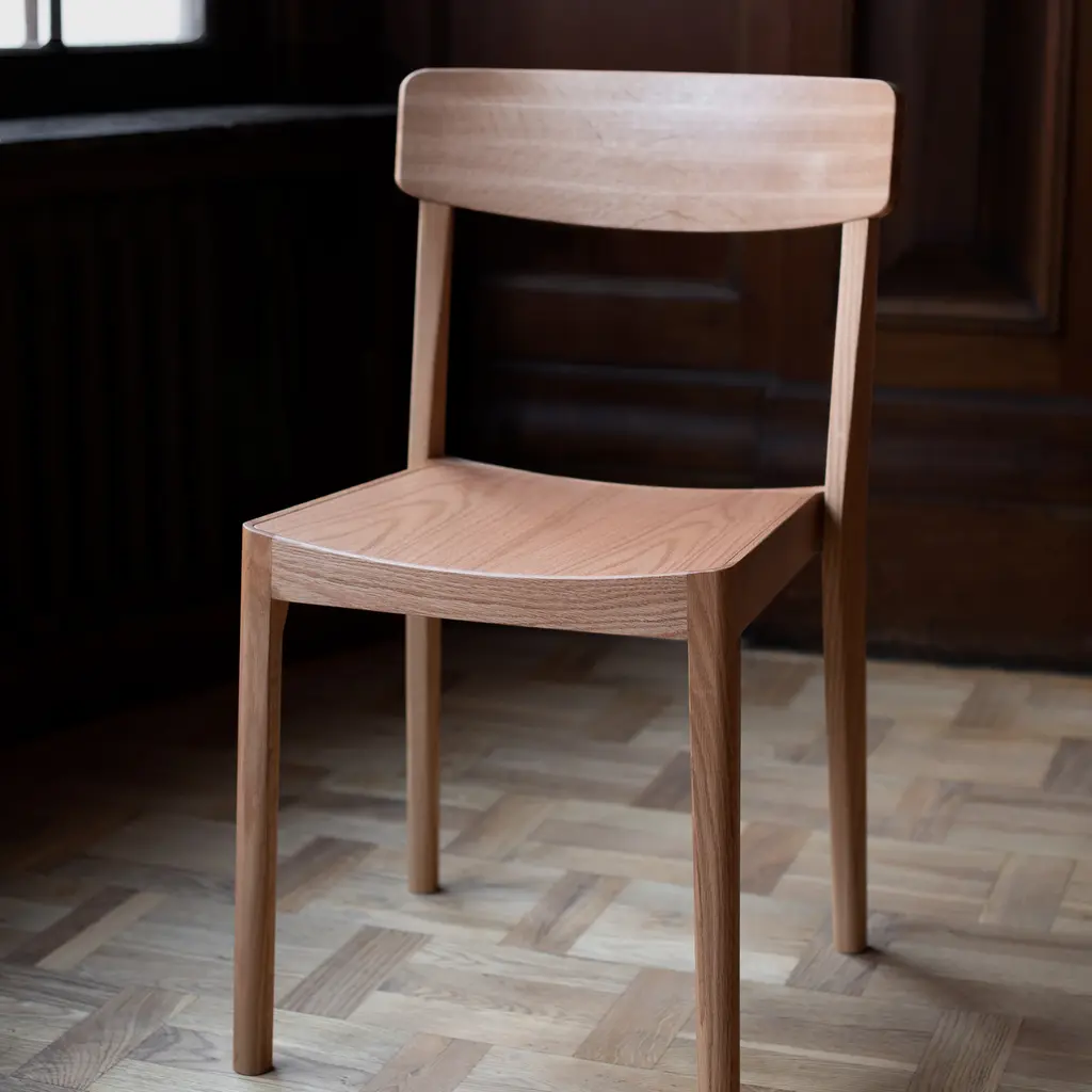 Designer Steffann Holm carefully considered both ergonomics and proportion while contriving his stackable Carved Chair, offered in a range of solid oak or ash finishes. The seating appears simple from afar but features subtle transitions from its geometric elements to the comfortably rounded seat and backrest for its sculptural but sturdily functional character.