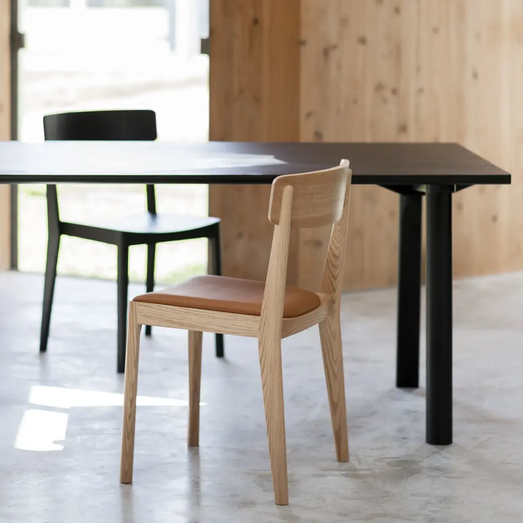 Upping the ante in both comfort and individuality, Carved Chair is also available with a custom-upholstered seat in leather or fabric to complement its wooden structure. Readily stackable, the seating by designer Steffann Holm combines the comfortable ergonomics of its rounded contours with a crisp geometric frame, adding up to a fine melding of style and functionality.