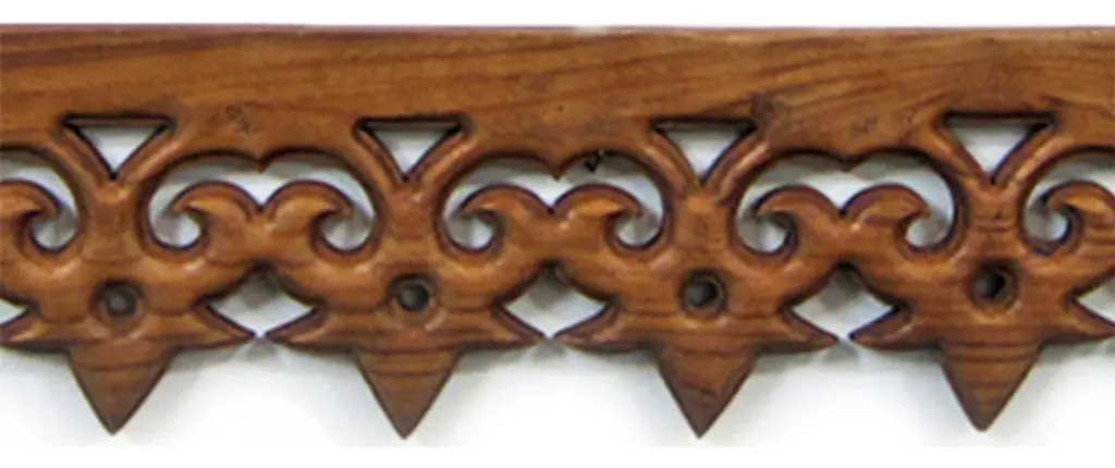 Beautiful carved teak wood architectural moulding trim piece. Can be used indoors or out. If left untreated and exposed to outdoor elements, teak wood will naturally weather into a lighter patina over time. Multiple pieces are available which can be joined together. Each unique in natural wood grain and other differences inherent to the material.• Moulding only - does not include any installation hardware.