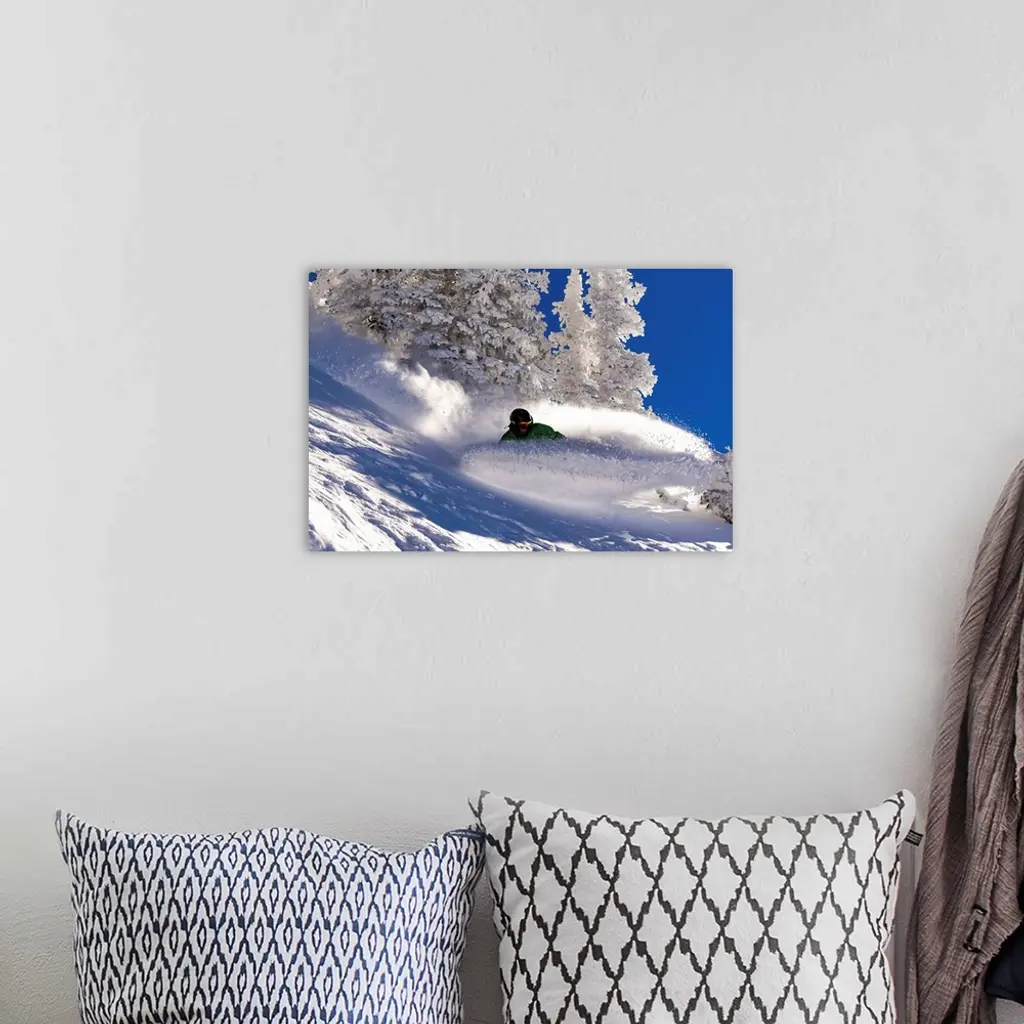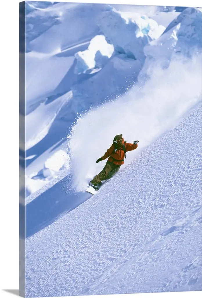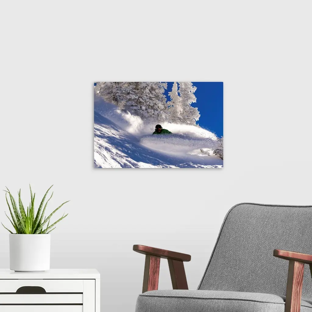 Action shot of a snowboarding carving down the Wasatch Range in Utah.