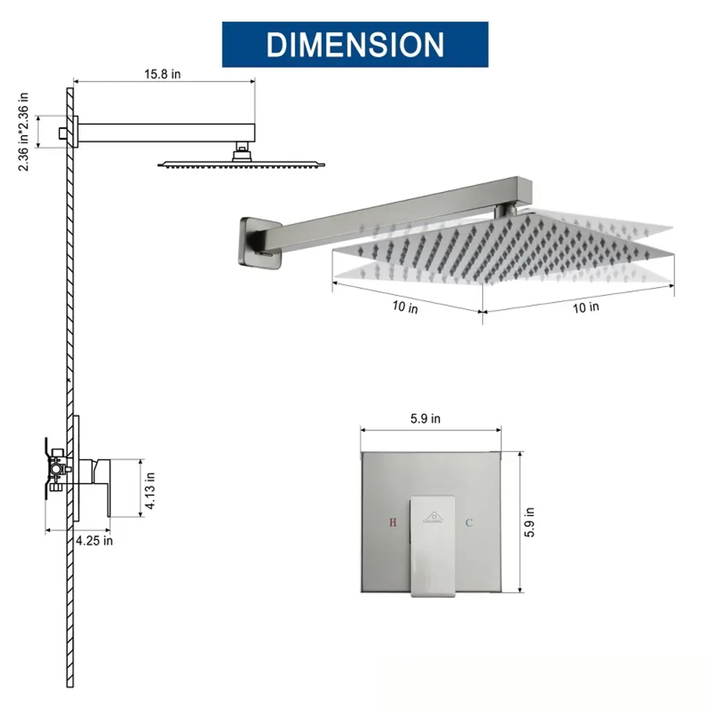 Casainc 1-spray Pattern With 1.8 Gpm 10 In. With 1.8 Gpm Wall Mount Square Fixed Shower Head In Brushed Nickel (Valve Included)