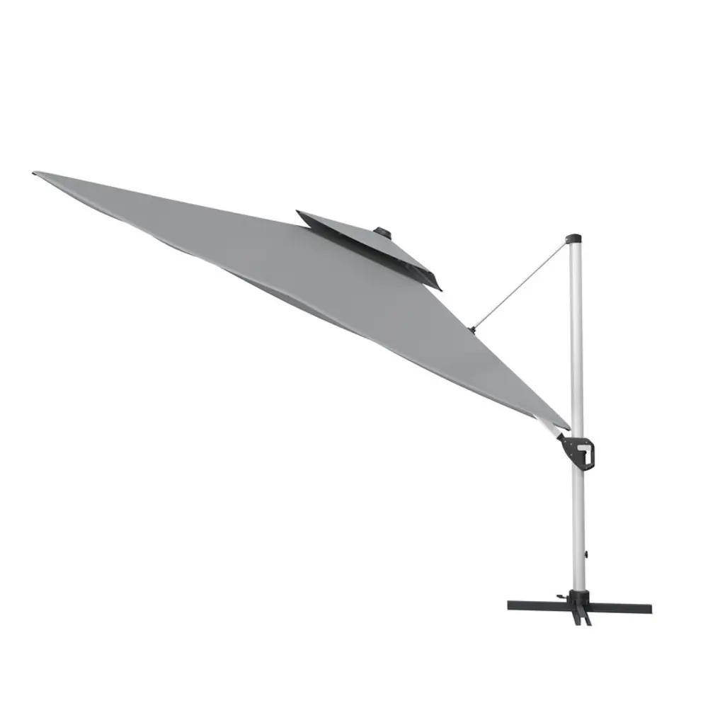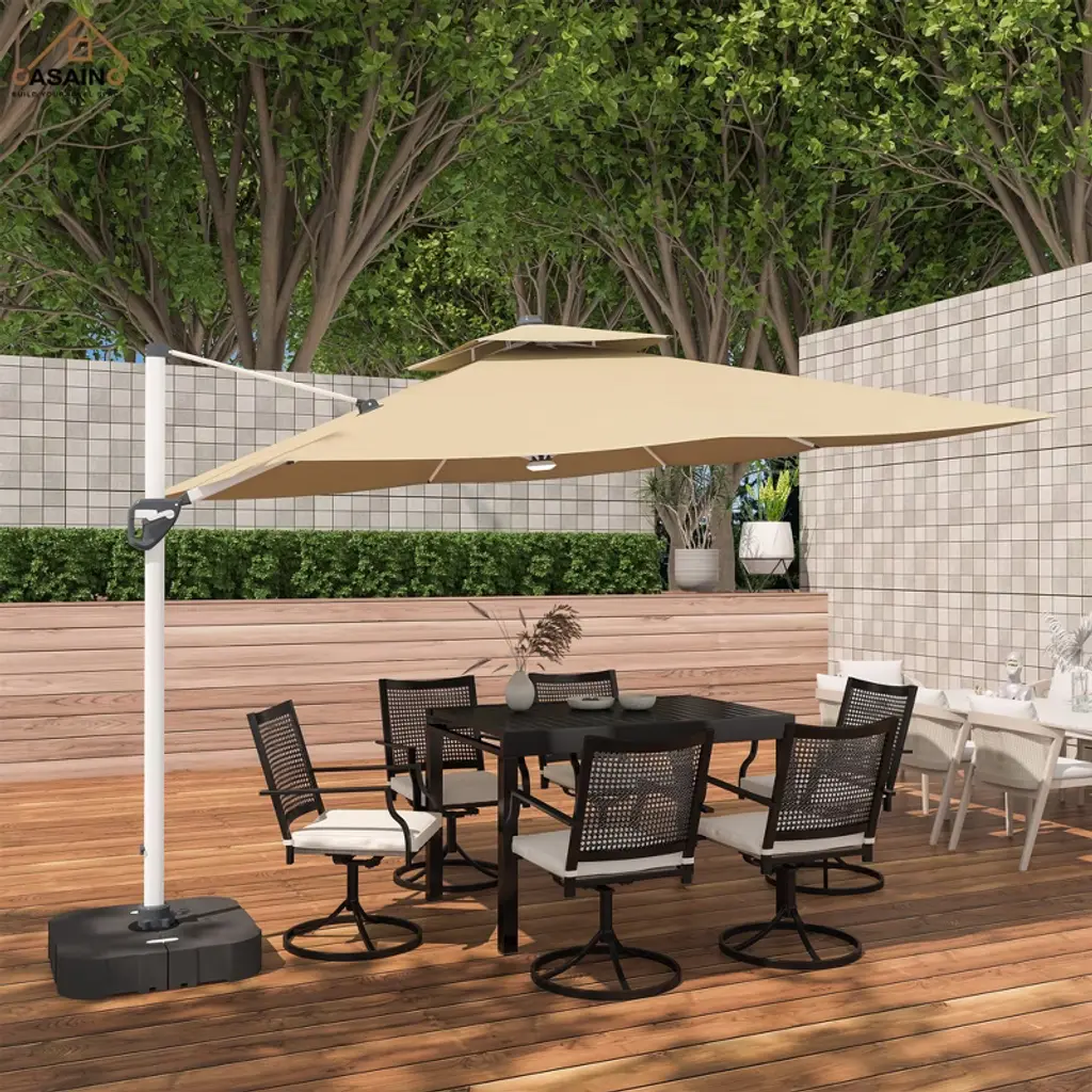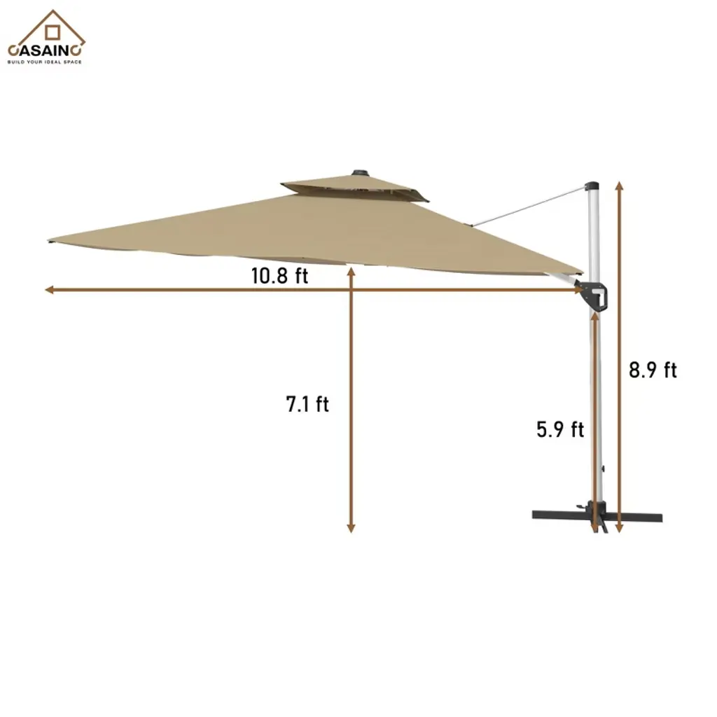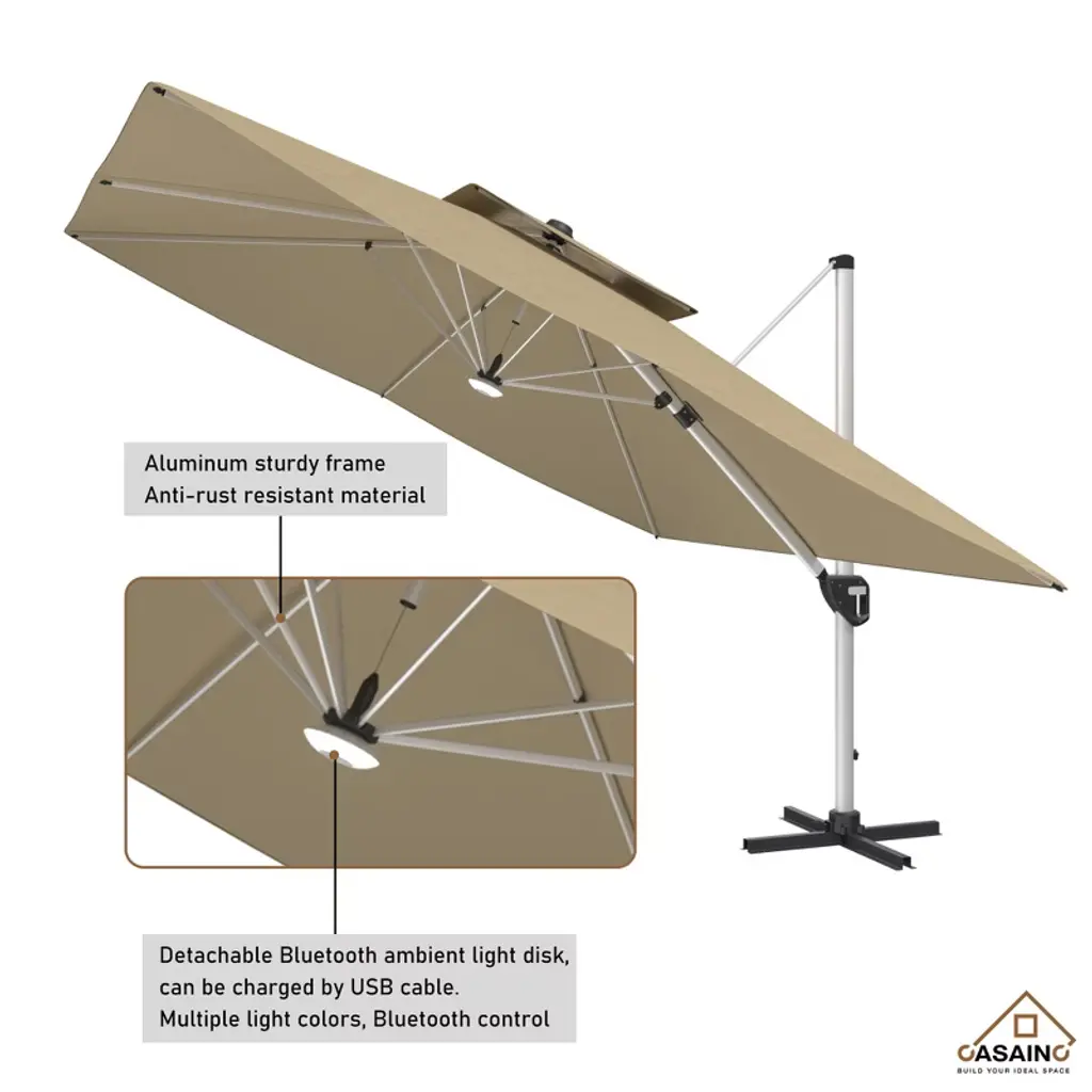 Upgrade your outdoor space with the CASAINC 11 ft Square Cantilever Patio Umbrella, a luxurious blend of innovation, function, and comfort. Designed for homeowners, designers, and outdoor entertainers, this umbrella features a double-top ventilated canopy that enhances airflow and reduces wind pressure, keeping you cool and relaxed even on the hottest days. The 360° foot-pedal rotation system and free-motion tilt handle let you effortlessly adjust shade coverage throughout the day. Crafted from durable rust-resistant aluminum with eight reinforced steel ribs, it delivers long-lasting performance and sophisticated style. The Bluetooth-enabled LED light panel adds ambiance and functionality—play your favorite music and choose lighting to match your mood. Perfect for patios, pool decks, and garden settings, this umbrella redefines outdoor comfort and style.