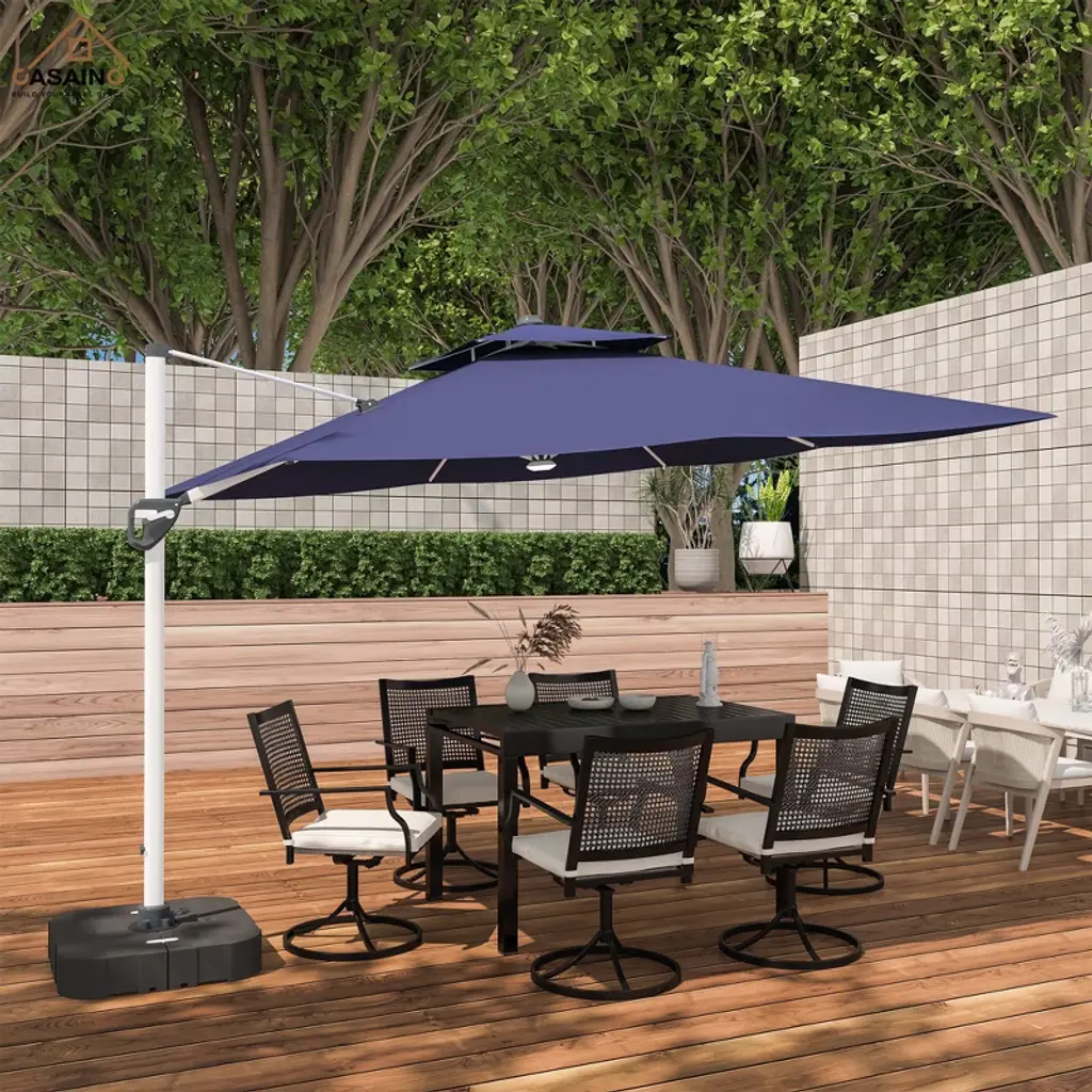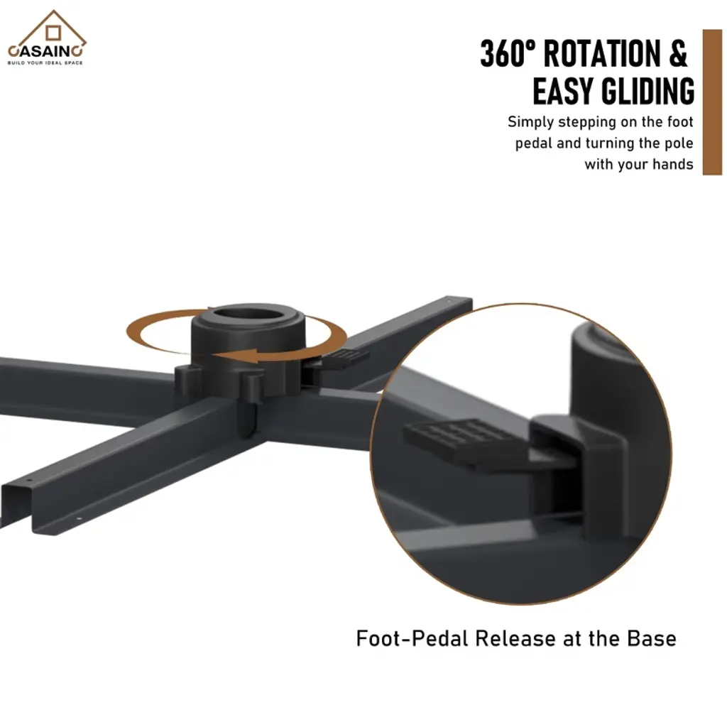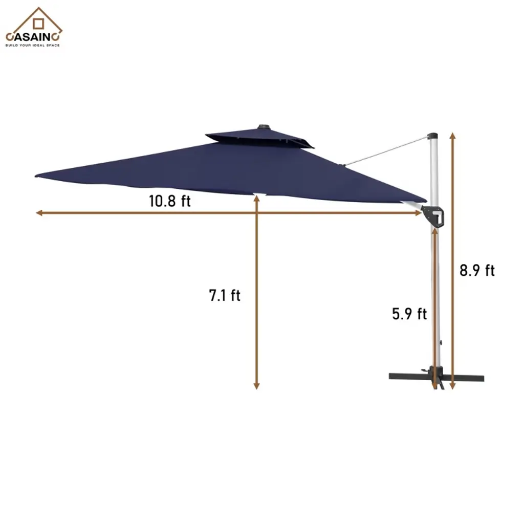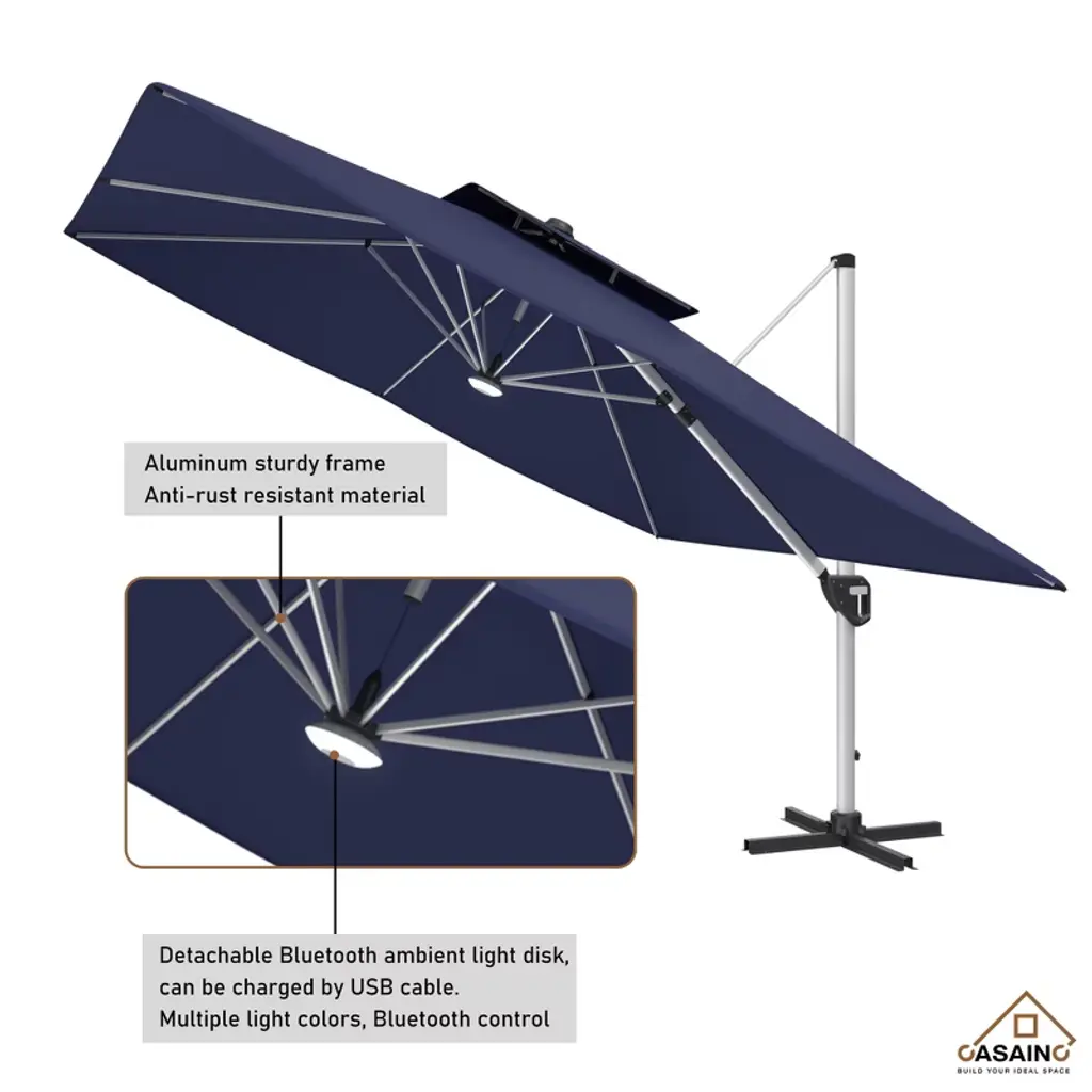 Upgrade your outdoor space with the CASAINC 11 ft Square Cantilever Patio Umbrella, a luxurious blend of innovation, function, and comfort. Designed for homeowners, designers, and outdoor entertainers, this umbrella features a double-top ventilated canopy that enhances airflow and reduces wind pressure, keeping you cool and relaxed even on the hottest days. The 360° foot-pedal rotation system and free-motion tilt handle let you effortlessly adjust shade coverage throughout the day. Crafted from durable rust-resistant aluminum with eight reinforced steel ribs, it delivers long-lasting performance and sophisticated style. The Bluetooth-enabled LED light panel adds ambiance and functionality—play your favorite music and choose lighting to match your mood. Perfect for patios, pool decks, and garden settings, this umbrella redefines outdoor comfort and style.