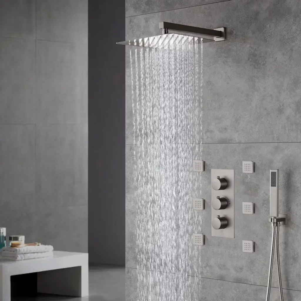 Casainc 12 Inch Luxury Thermostatic Square Wall Mounted Shower Faucet With 6 Body Jets & Handheld Spray