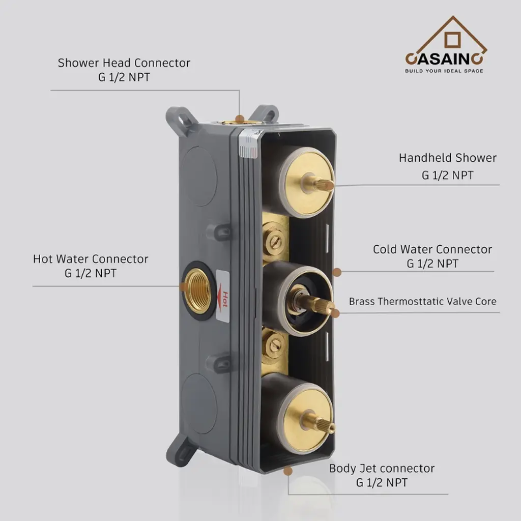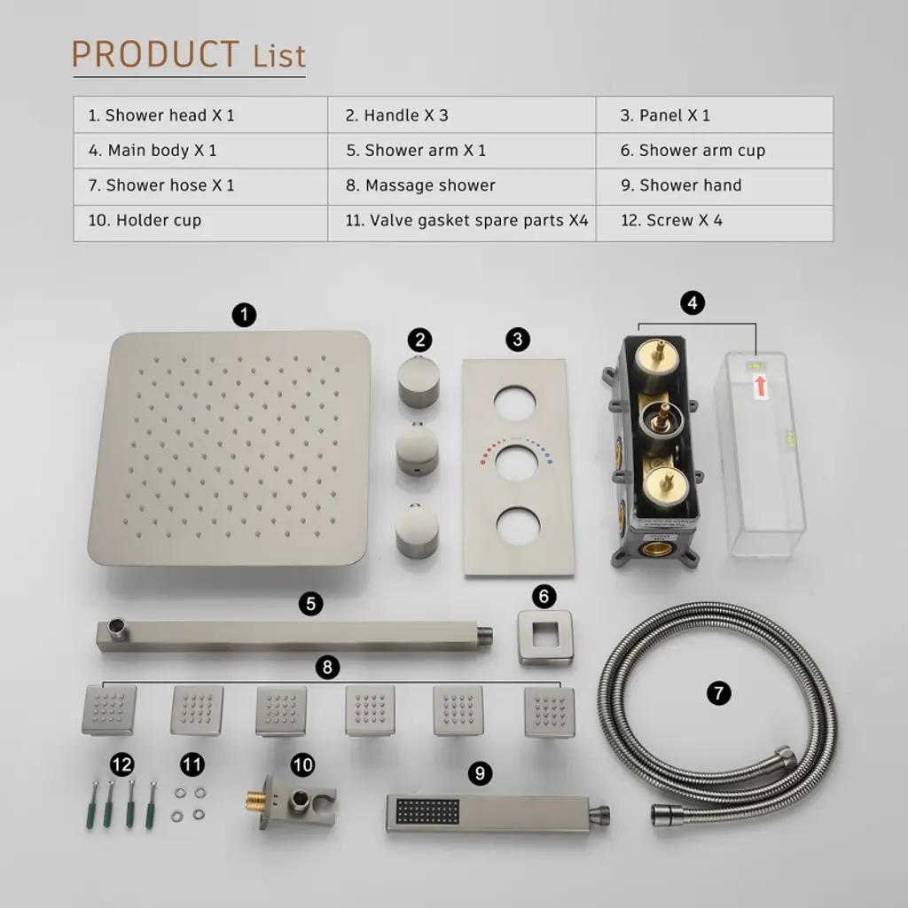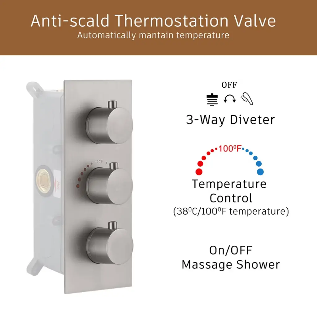 Introducing our 12in stainless steel shower head with brass hand shower and 6 brass body jets. The brass main body surface give this shower system a luxurious appearance. The three-function advanced design brings a comfortable and massage shower experience. The thermostatic valve core has passed the cUPC certification, which is more safe.