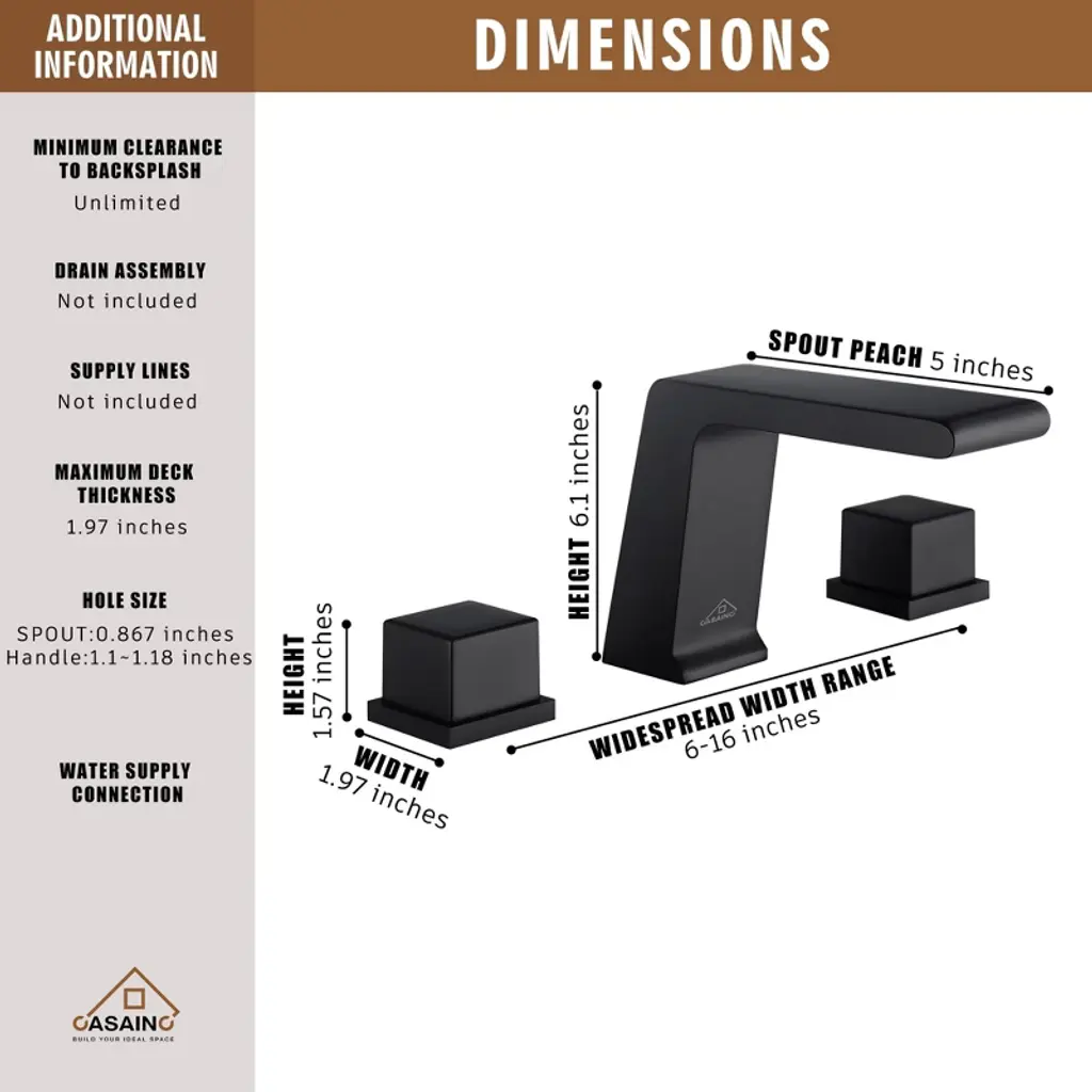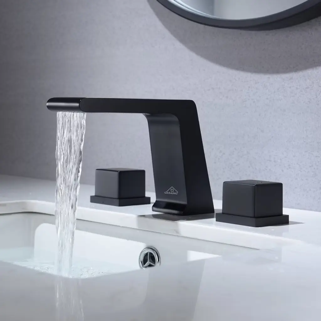 Upgrade your bathroom with the refined performance and clean lines of the CASAINC 8 in. Widespread Double Handle Bathroom Faucet. Designed to enhance both function and aesthetic appeal, this faucet features a graceful square-line silhouette and a double-handle layout that offers precision control over water temperature and flow. Its waterfall-style spout delivers a calming, visually appealing stream of water, ideal for daily routines or spa-inspired moments. Built with solid brass and premium valve components, this faucet is engineered for long-term durability and corrosion resistance. Whether for new construction or a remodel, its 3-hole deck-mount design fits most widespread sink setups between 6 and 12 inches, with standard U.S. plumbing connections that make installation simple and secure.