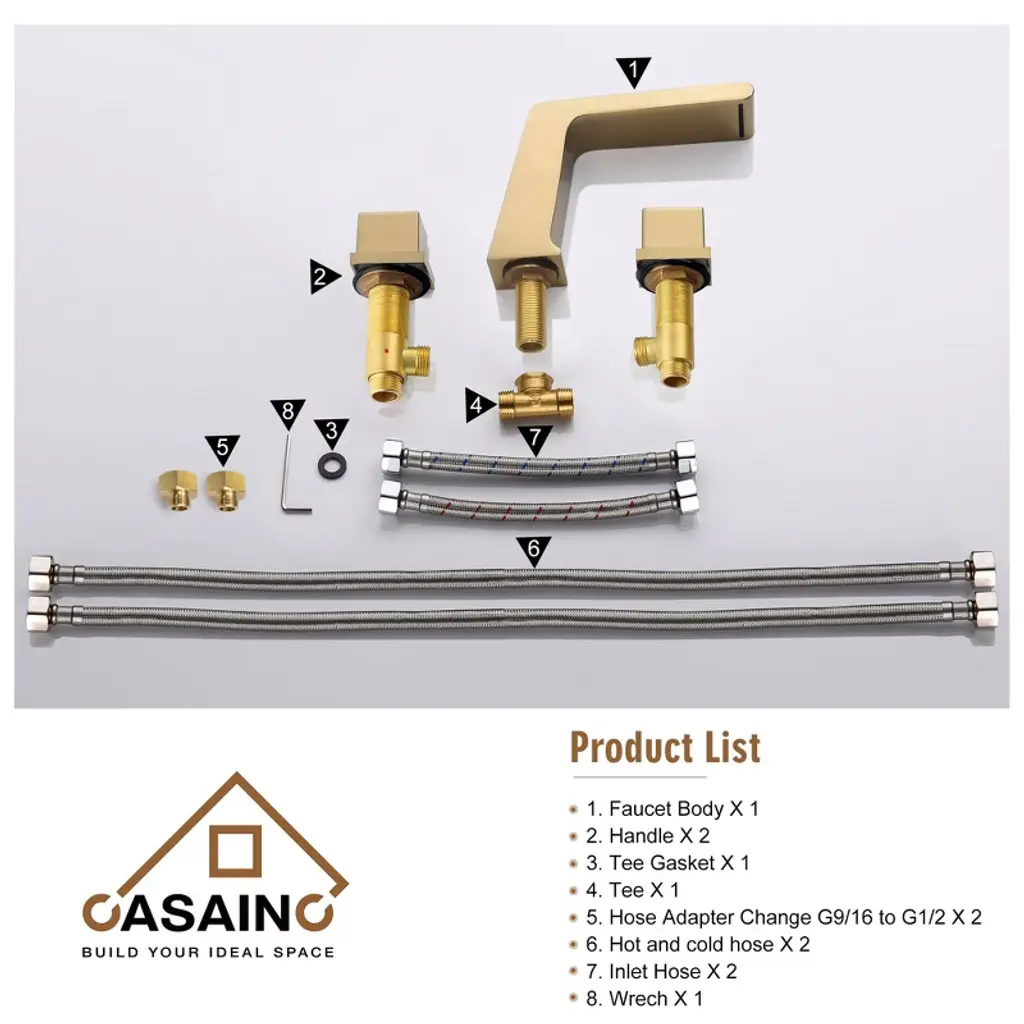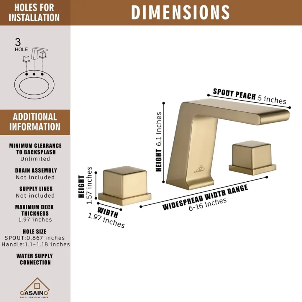 Upgrade your bathroom with the refined performance and clean lines of the CASAINC 8 in. Widespread Double Handle Bathroom Faucet. Designed to enhance both function and aesthetic appeal, this faucet features a graceful square-line silhouette and a double-handle layout that offers precision control over water temperature and flow. Its waterfall-style spout delivers a calming, visually appealing stream of water, ideal for daily routines or spa-inspired moments. Built with solid brass and premium valve components, this faucet is engineered for long-term durability and corrosion resistance. Whether for new construction or a remodel, its 3-hole deck-mount design fits most widespread sink setups between 6 and 12 inches, with standard U.S. plumbing connections that make installation simple and secure.