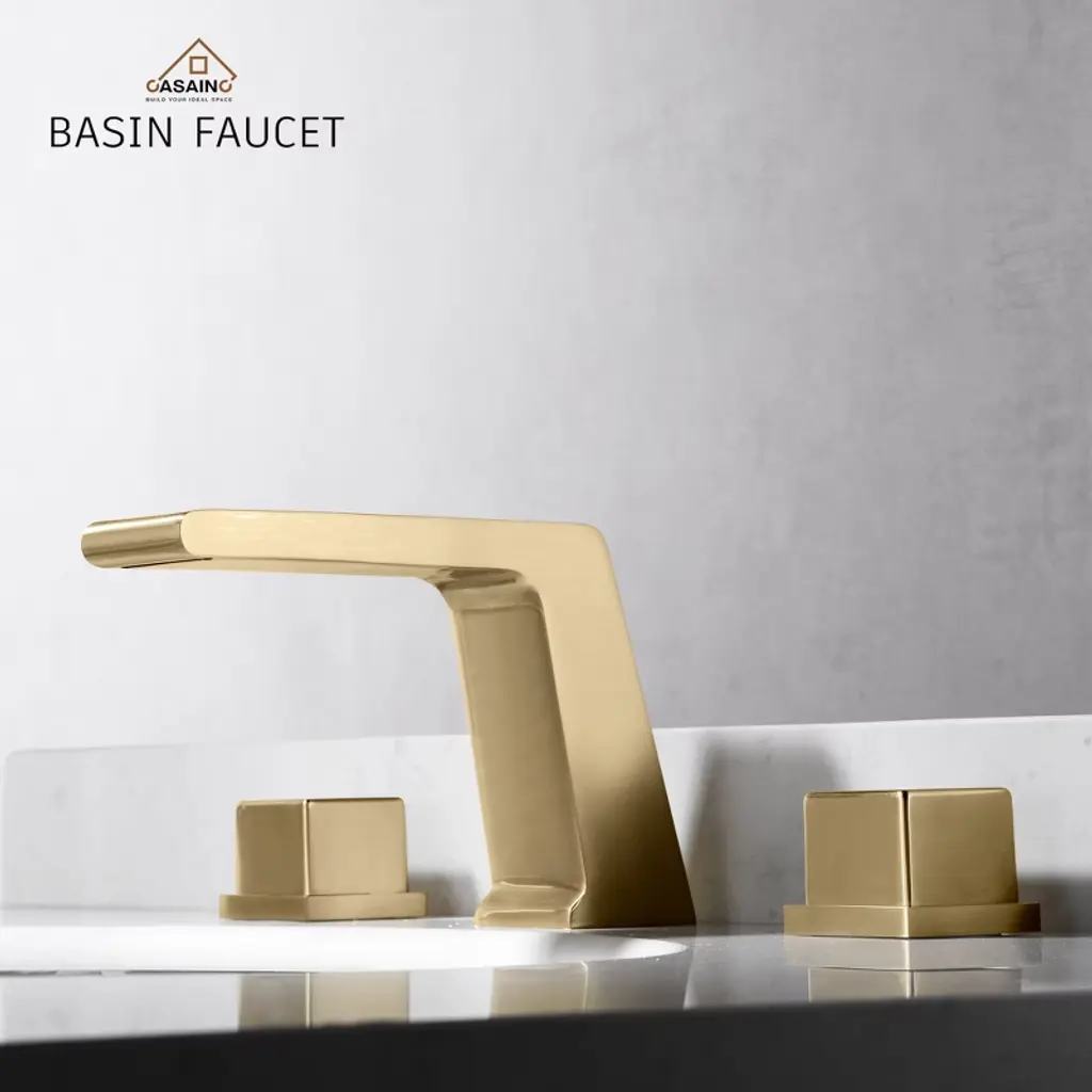 Casainc 3 Hole Deck Mounted Widespread Bathroom Faucet With Waterfall Spout And Matching Pop-up Drain, Gold